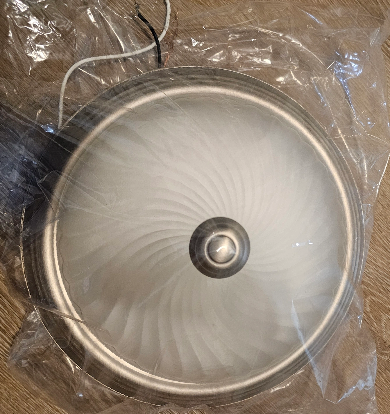 The light is still in its original packaging. Round fixture, possibly metal. Frosted glass dome shape. Perfect for illuminating your space with a soft glow. 6 in total, $5 each