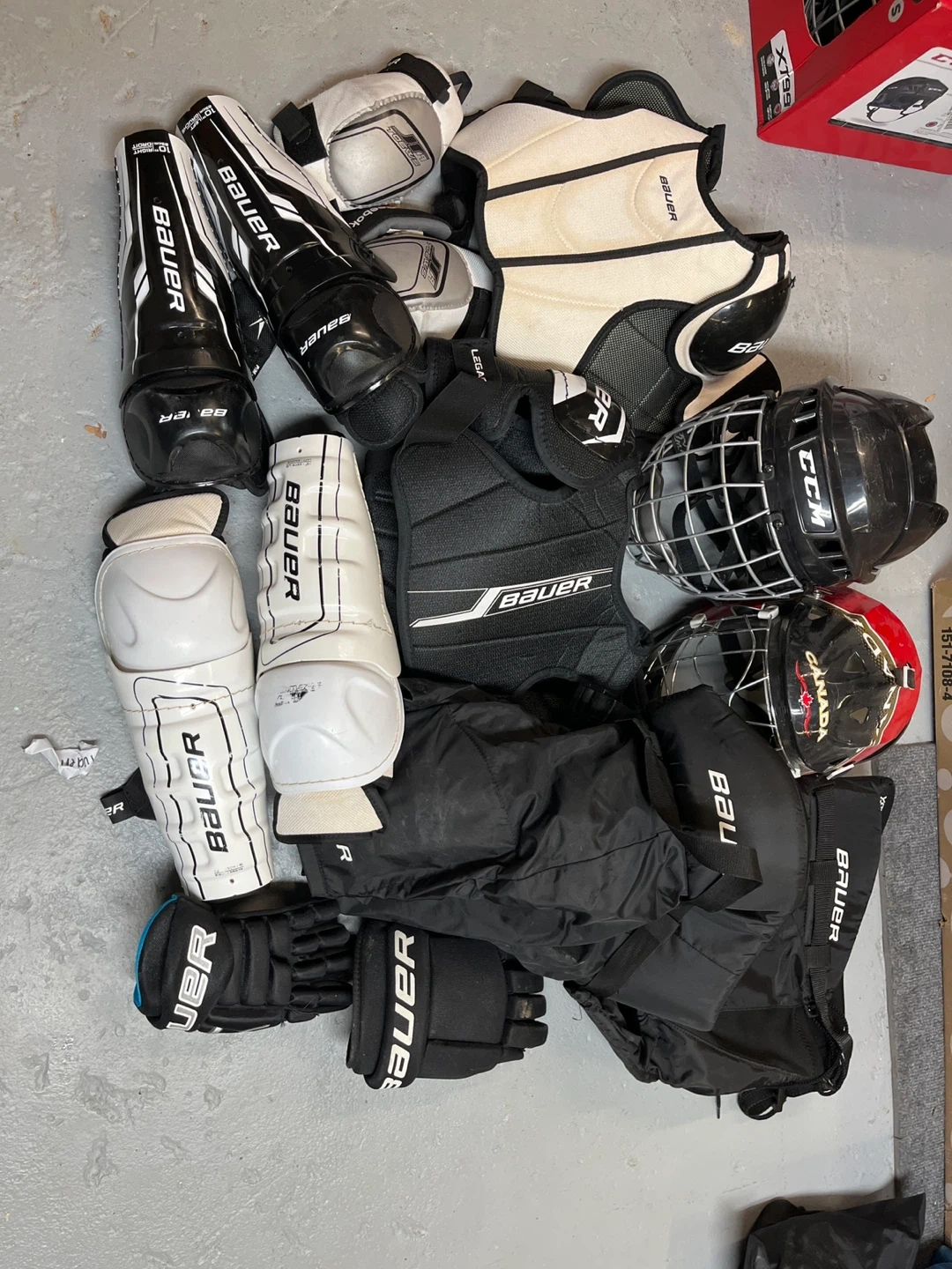 Almost two full kits, Includes Bauer shin pads, chest protector, pants, and gloves. Also features a CCM helmet (youth medium) and goalie helmet. Black and white colour scheme. Ready for the ice!