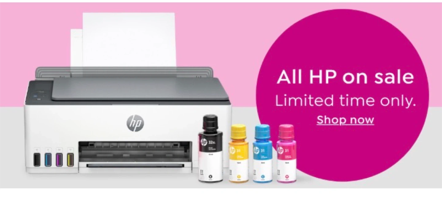 HP Smart Tank printer. Includes ink bottles in black, yellow, cyan, and magenta. It's a refillable ink tank system.