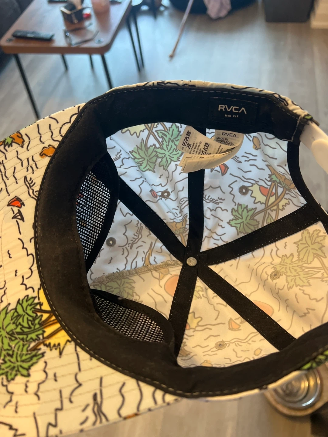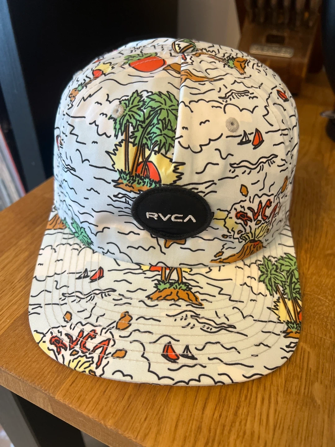 RVCA "Mid Fit" baseball cap with a fun tropical island and sailing print. It's a stylish accessory for sunny days. Adjustable strap at the back for a custom fit.