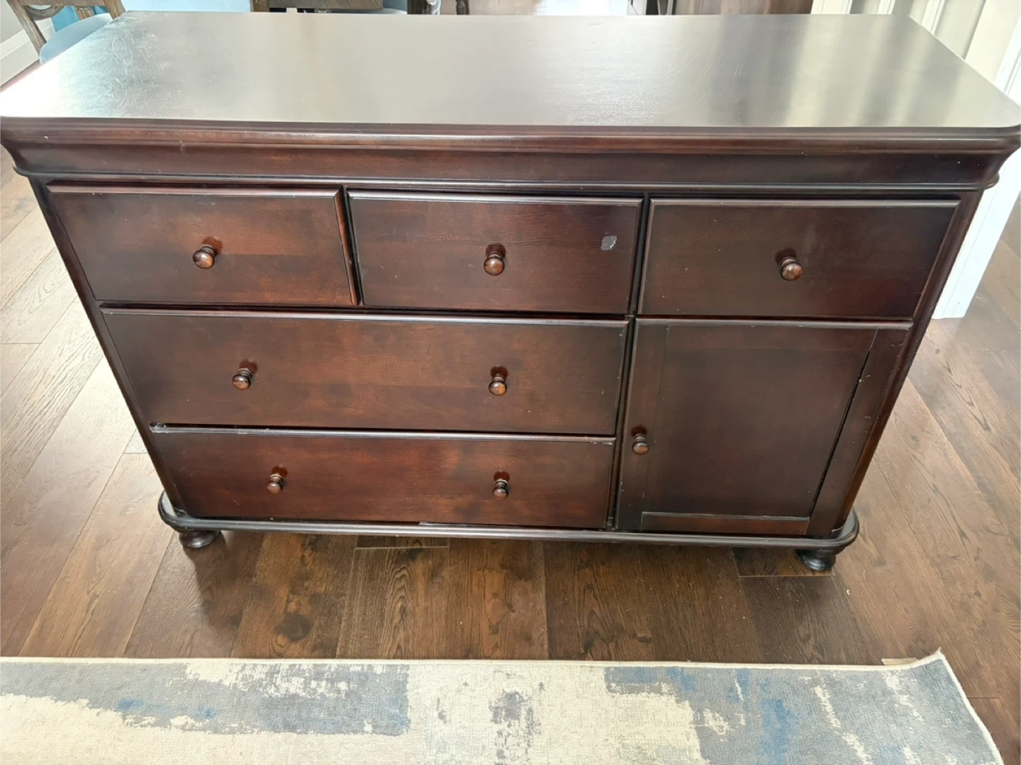 This dresser is a rich, dark wood finish. It features seven drawers and one cabinet door for ample storage. The hardware is a matching dark wood. It's a sturdy piece for any bedroom!