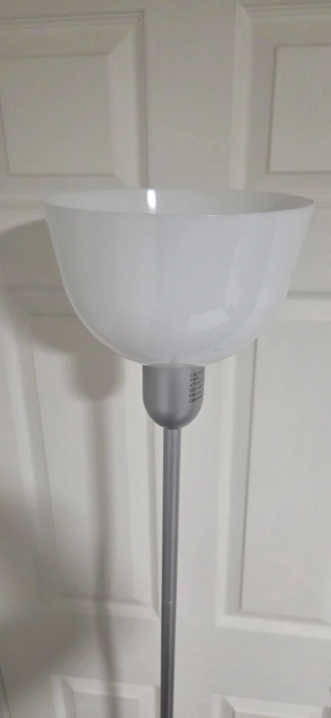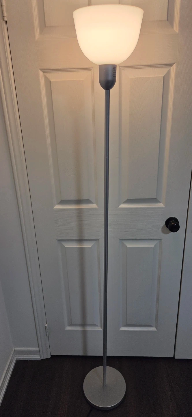 This is a tall floor lamp with a white frosted shade. It has a silver-coloured metal pole and a round base. It's perfect for adding extra light to a room.