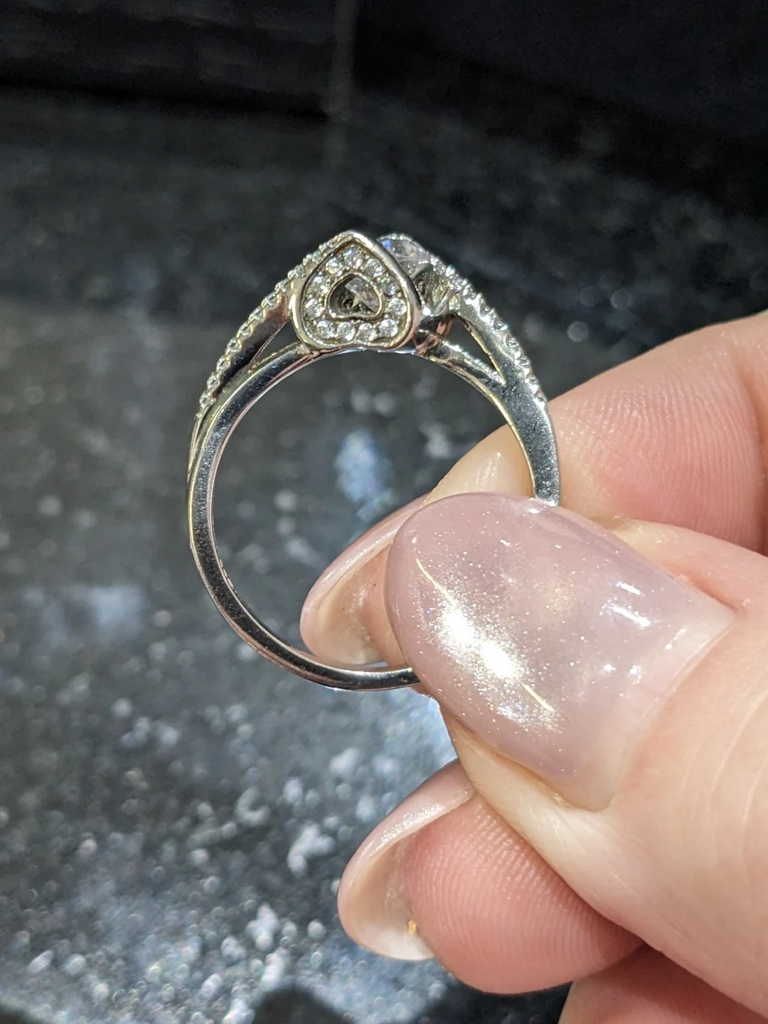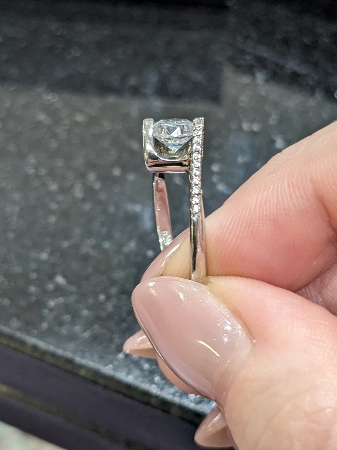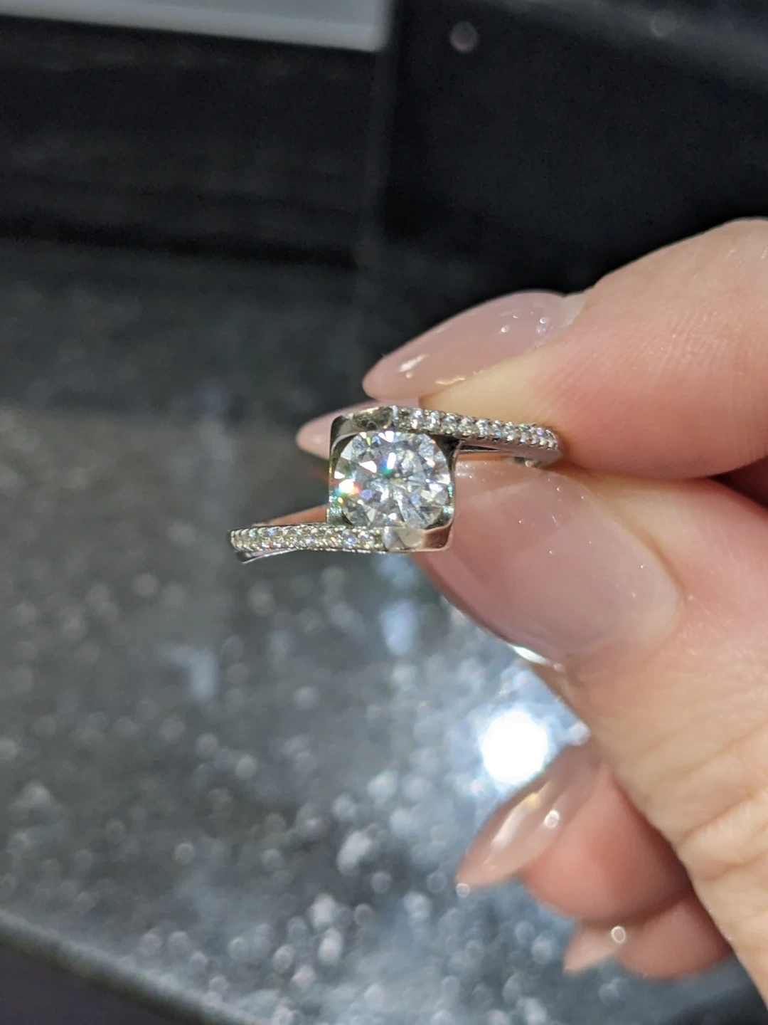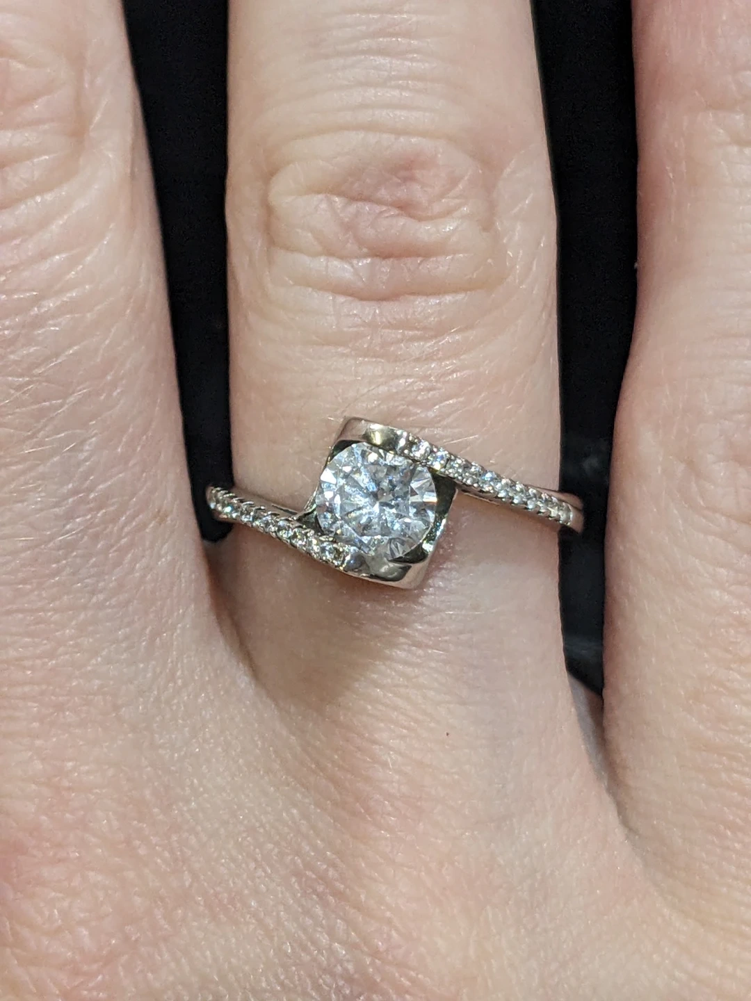 Beautiful sterling silver and cubic zirconia ring with a modern twist band (bypass). Set with a round brilliant cut centre stone and smaller accent stones along the band. Stamped 925, size 6. In excellent condition.