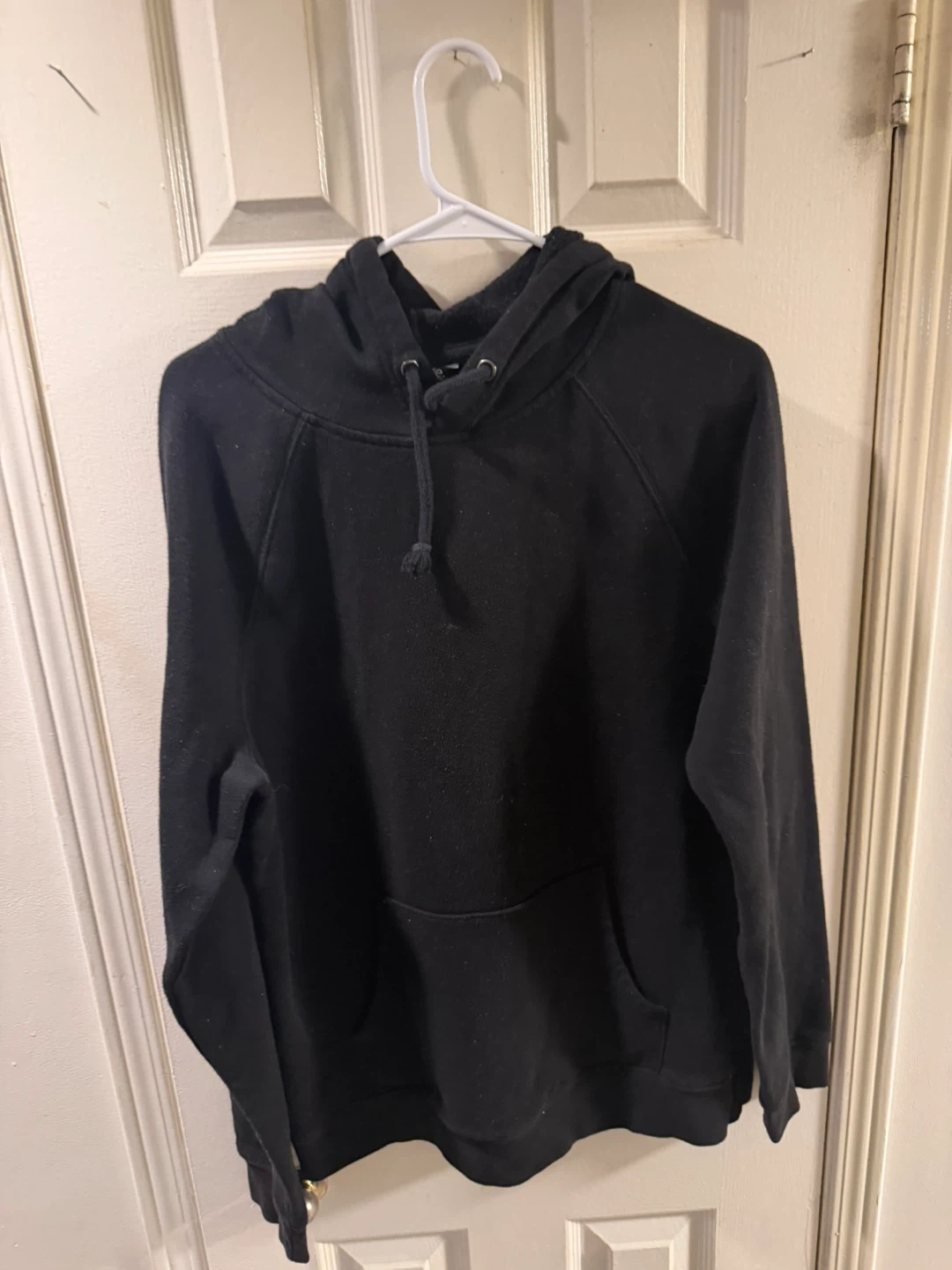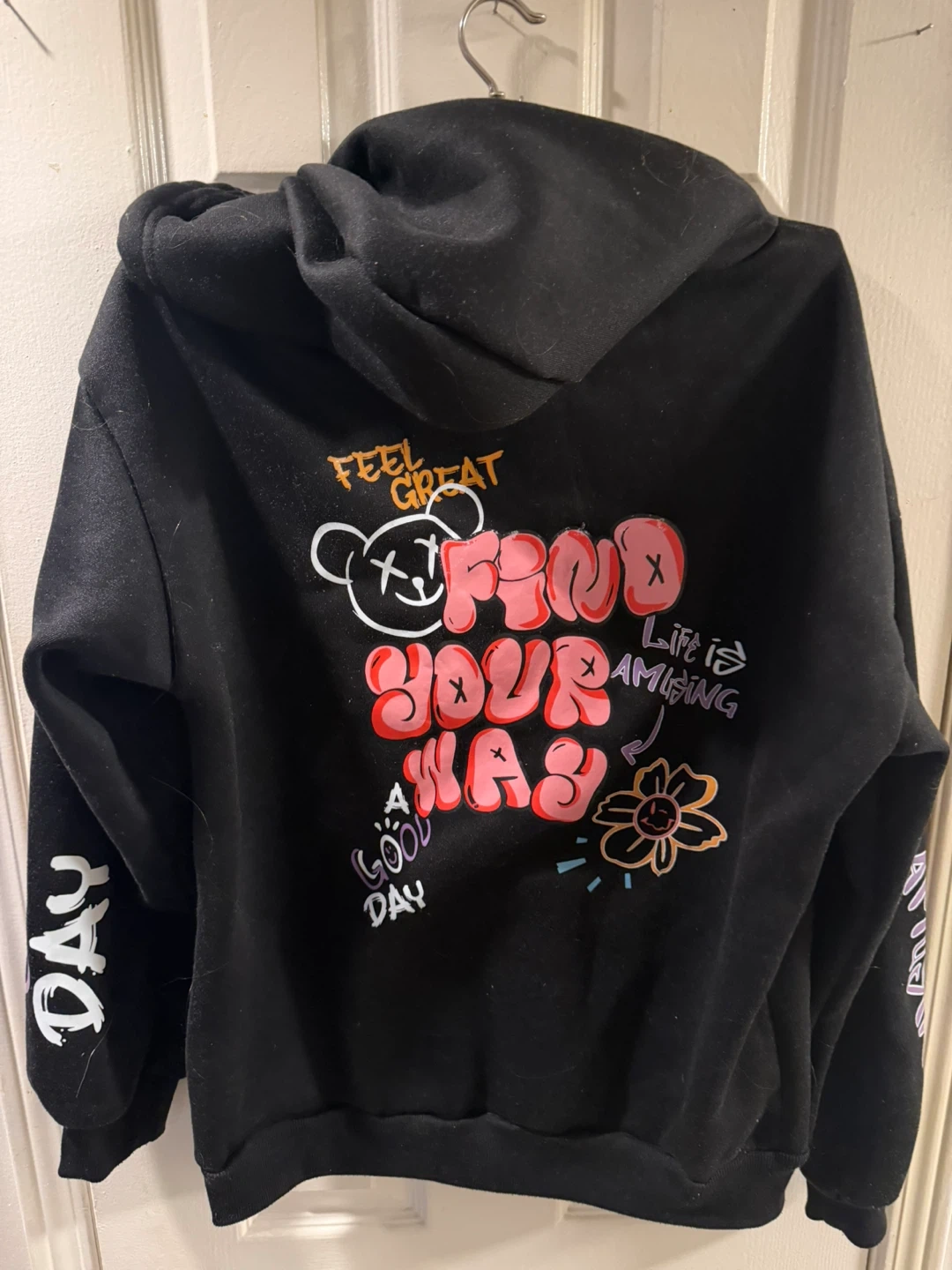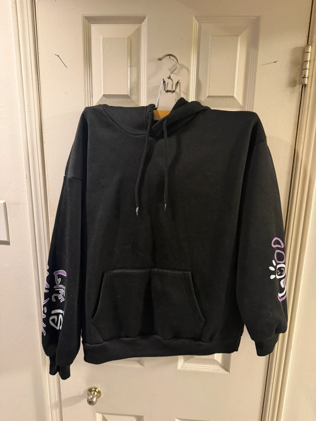 Black hoodie featuring a graphic print on the back and sleeves. It's a pullover style with a front pouch pocket and a drawstring hood. Made from a soft fabric blend.