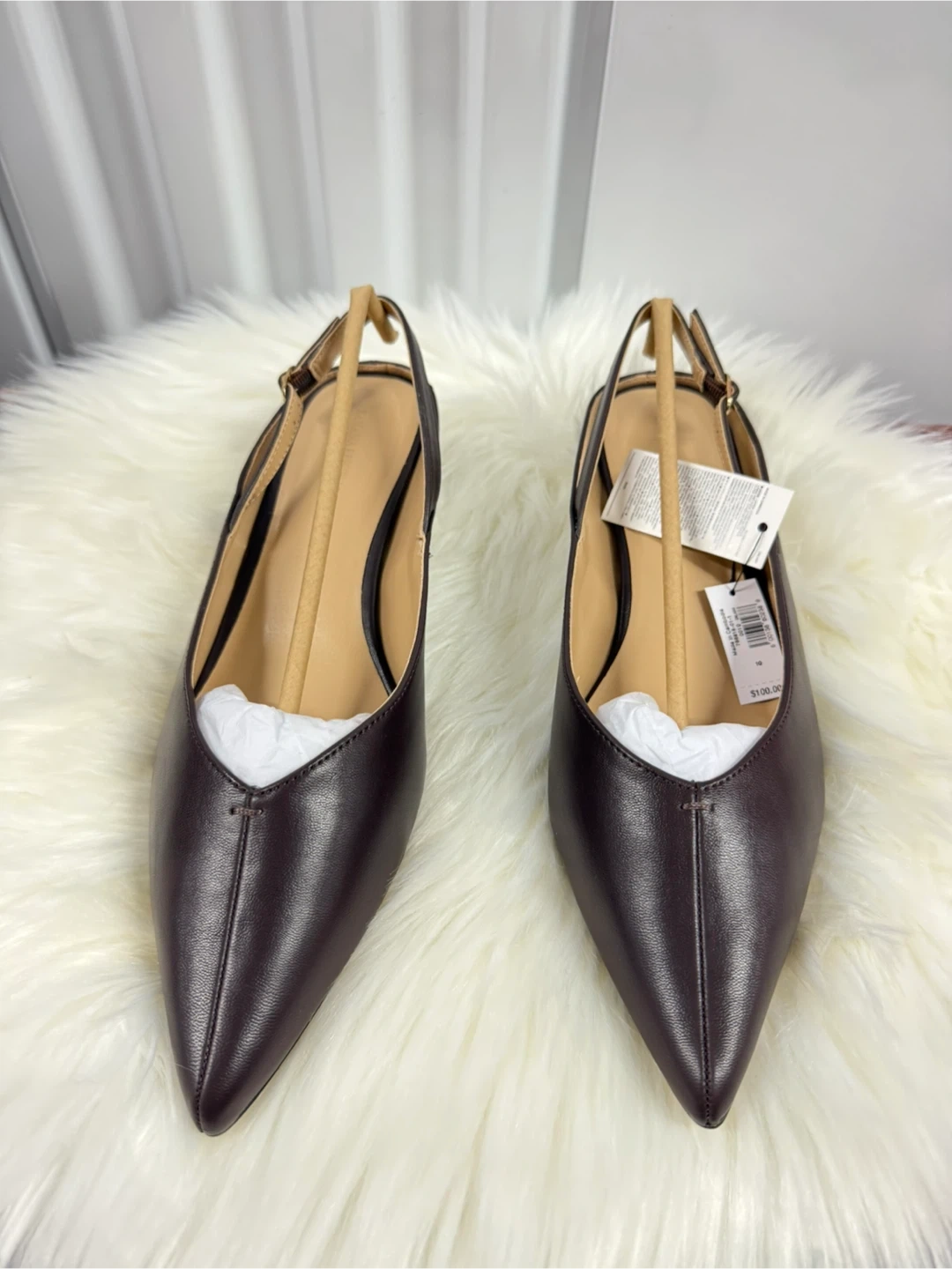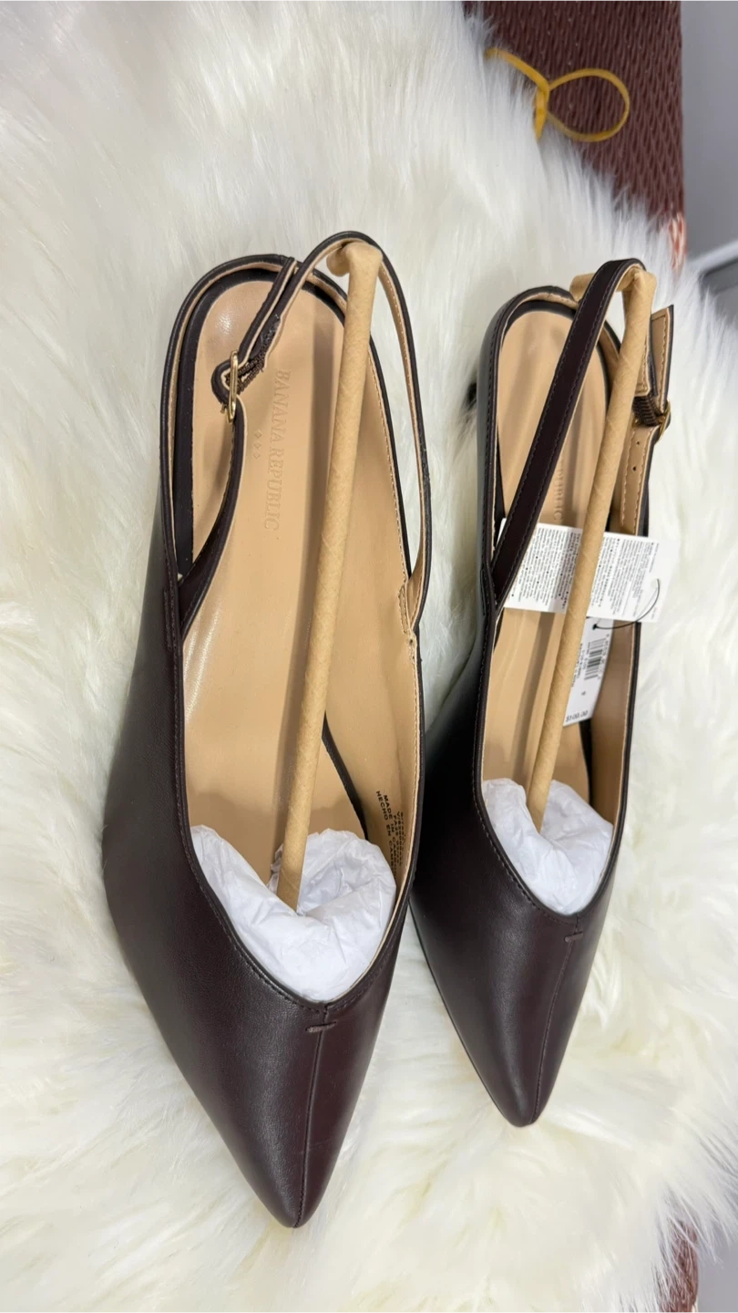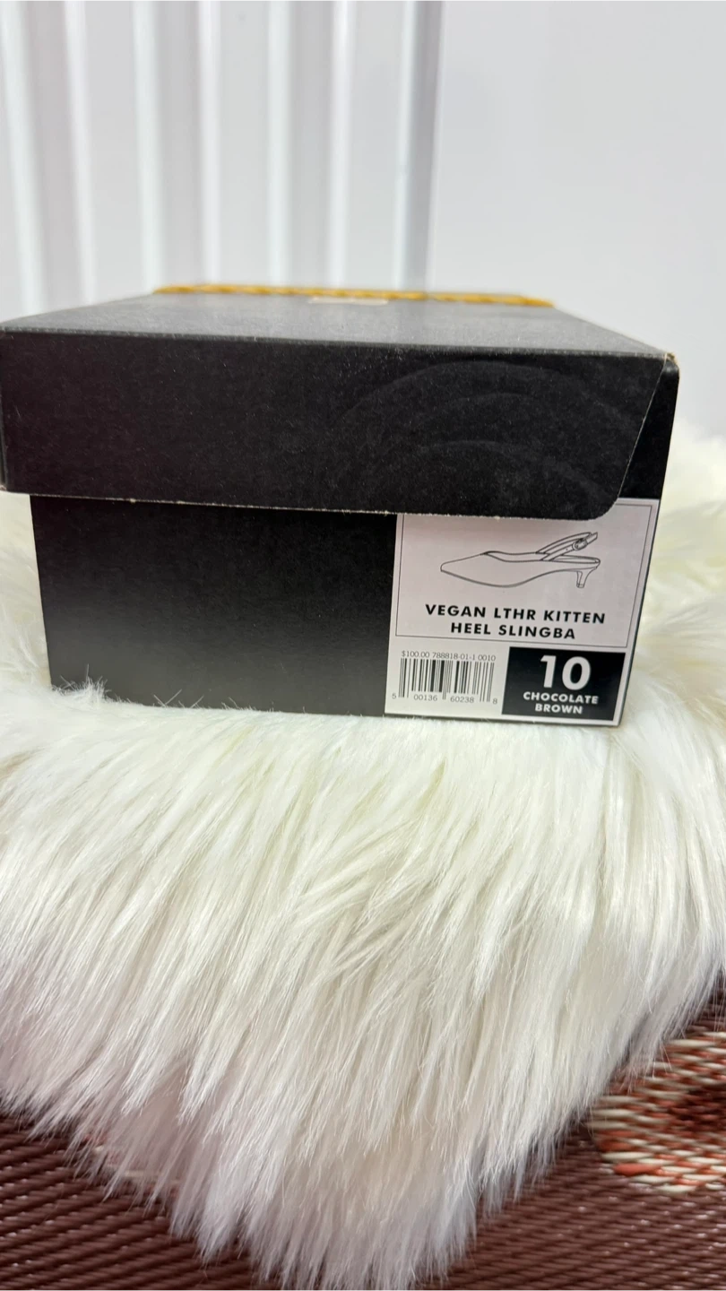 These Banana Republic kitten heel slingbacks are made from vegan leather in a chocolate brown color. They're a size 10 and come with their original box. Perfect for dressing up an outfit!