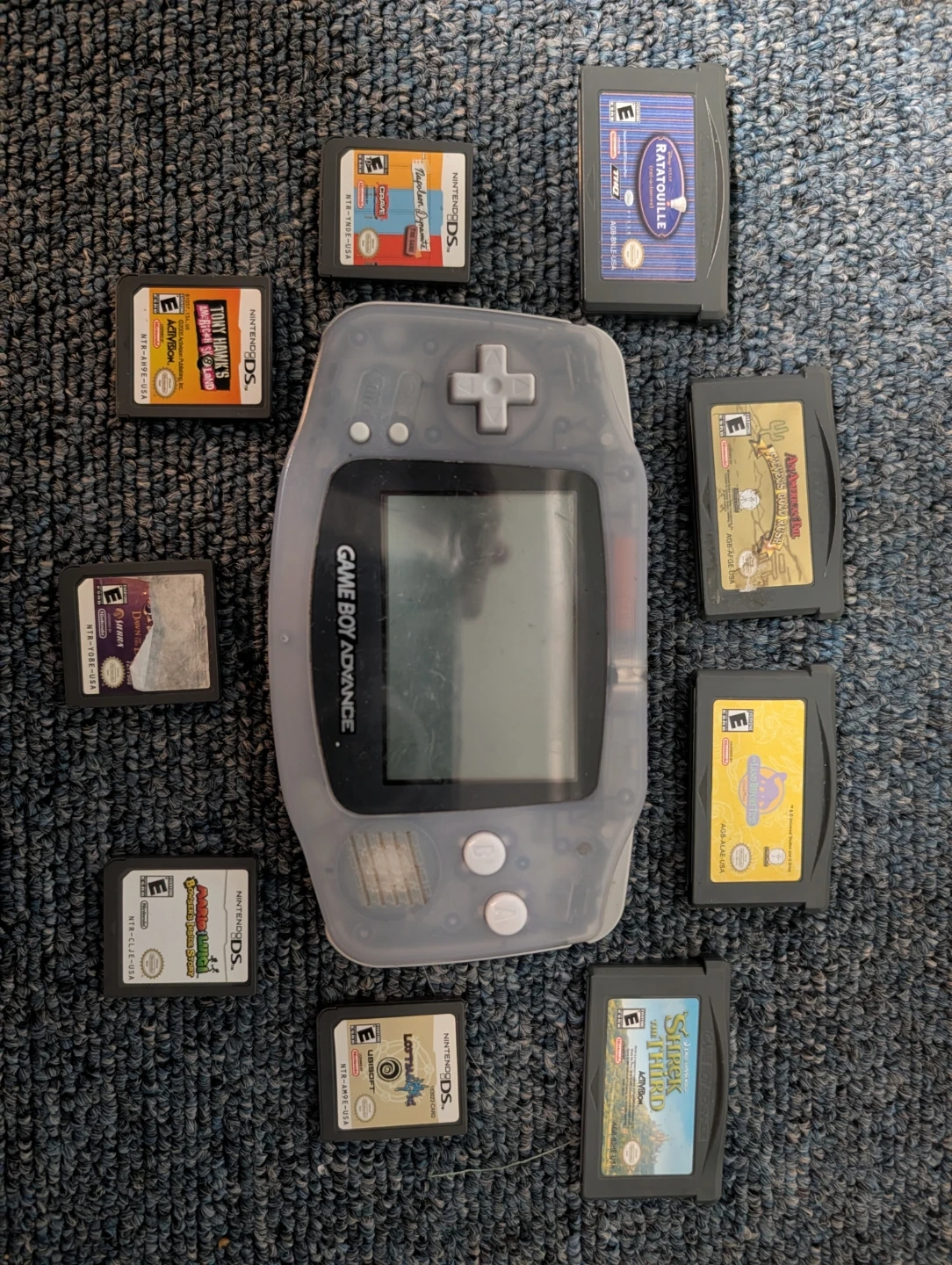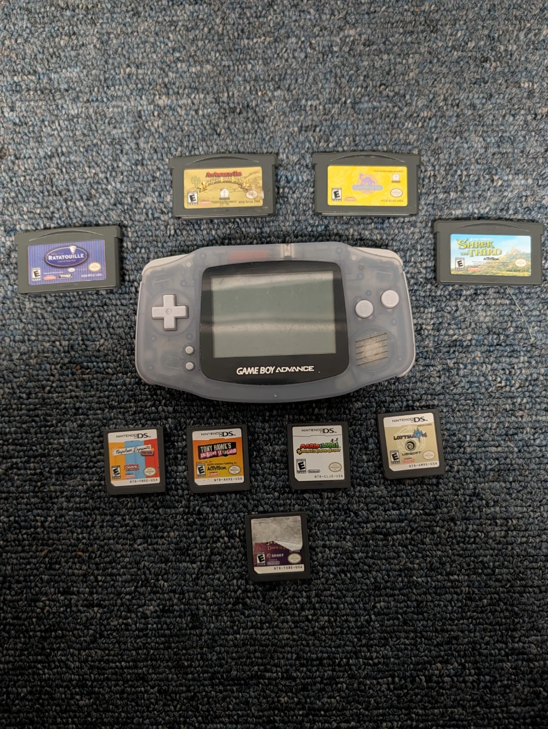 Selling a translucent Nintendo Game Boy Advance console. Includes all games shown in picture, the one with the ruined picture is Spyro Dawn of the dragon.
