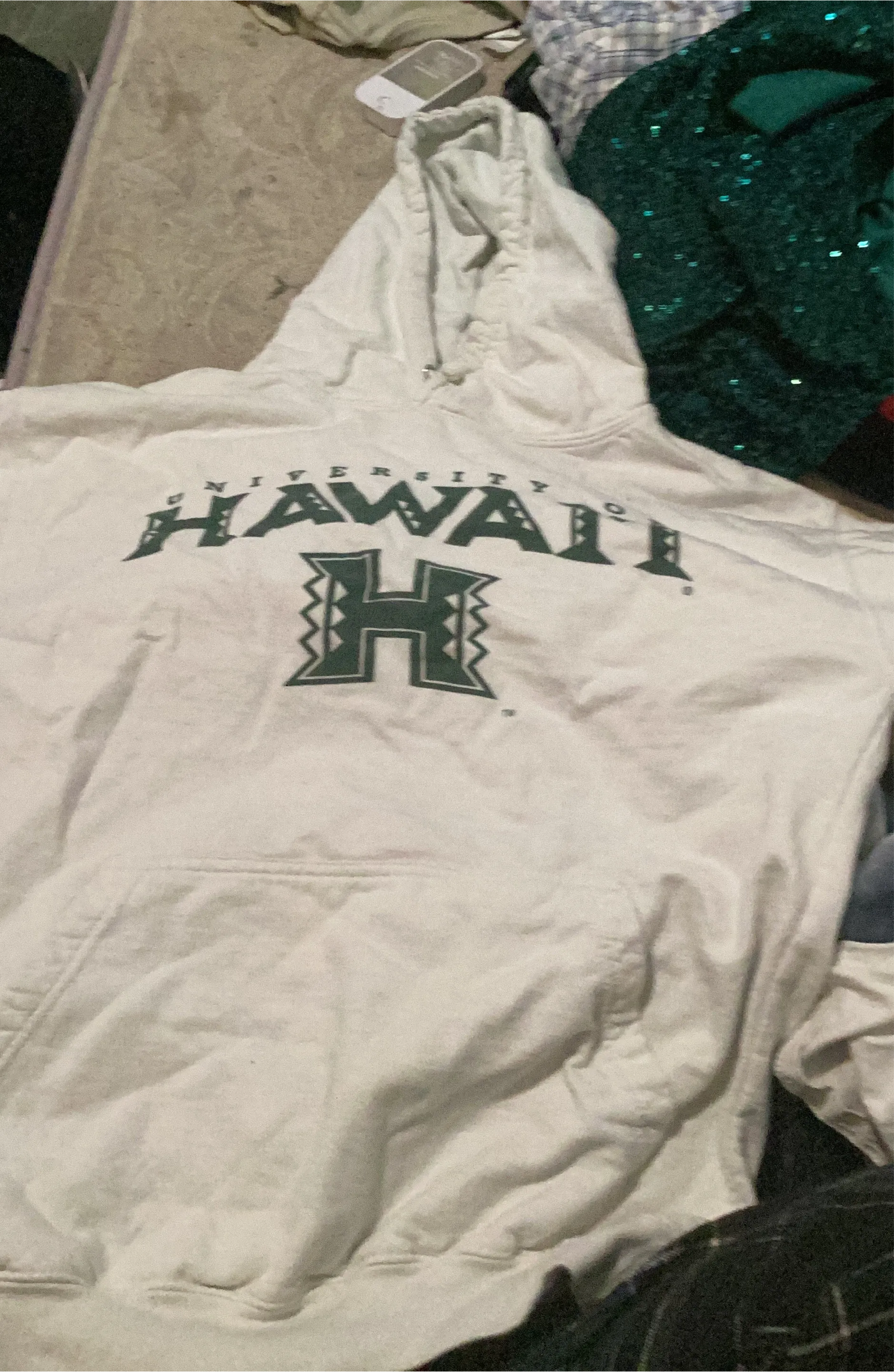 White hoodie with "University of Hawaii" and "H" logo printed in green. It's a pullover style with a front pocket. Cotton blend material.