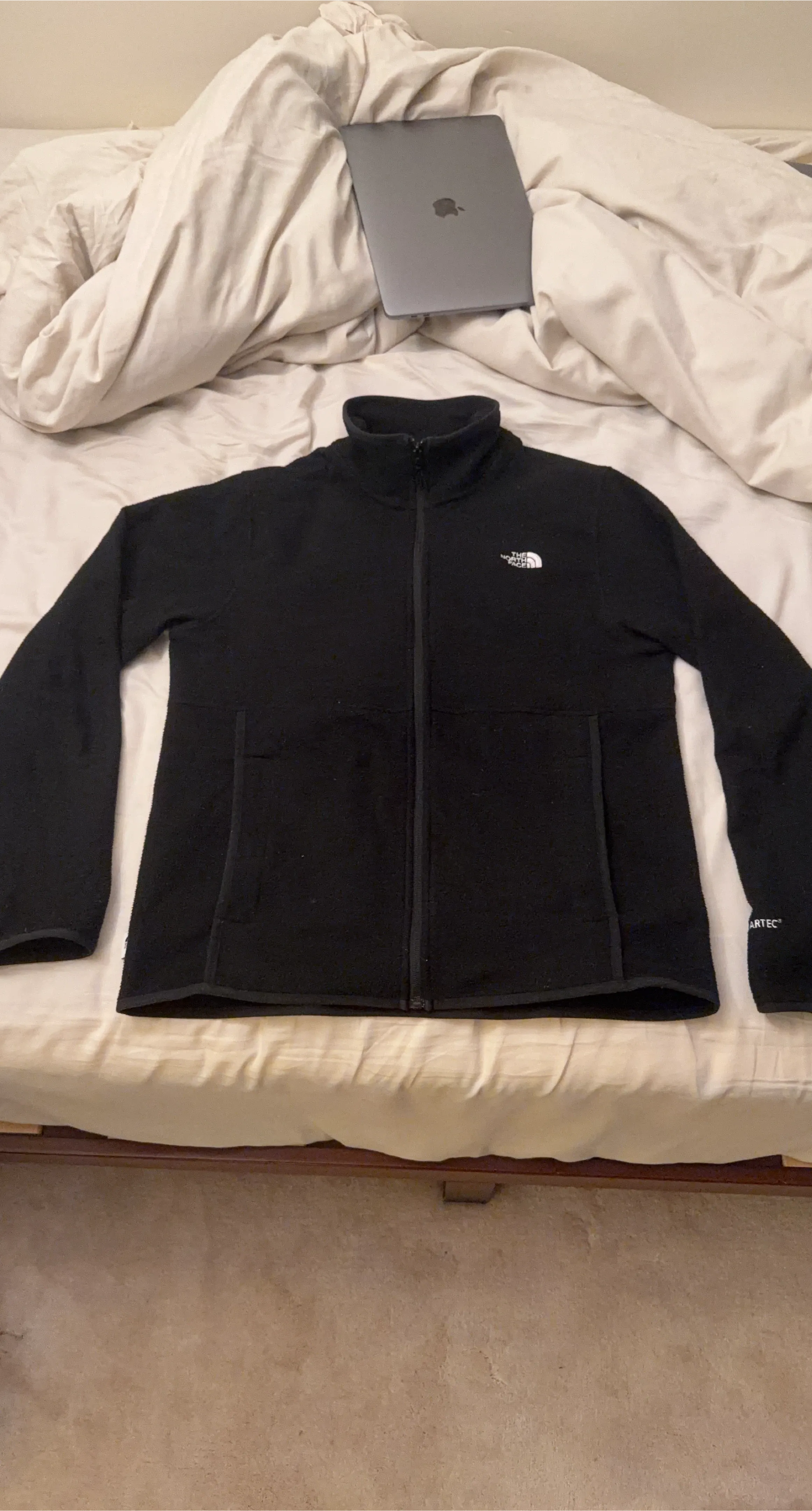 This is The North Face fleece jacket in black. It's made of fleece material for warmth. It has zippered pockets and a full zip closure.