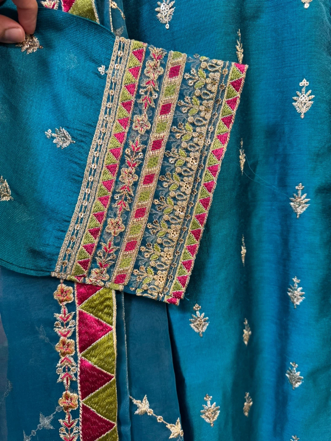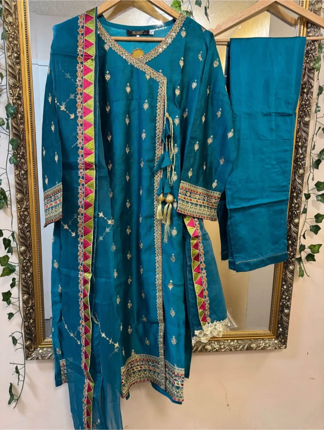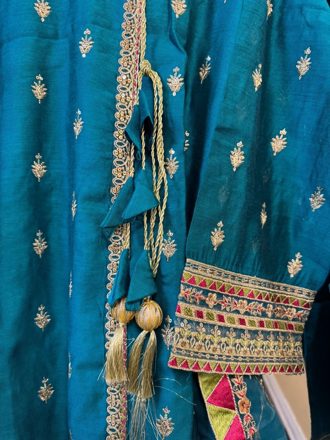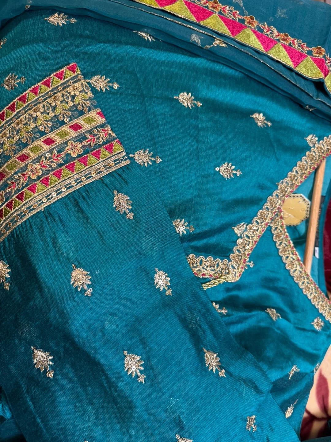 Beautiful teal shalwar kameez with intricate embroidery. Perfect for special occasions or everyday wear! The set includes the kameez (top), shalwar (pants), and dupatta (scarf).