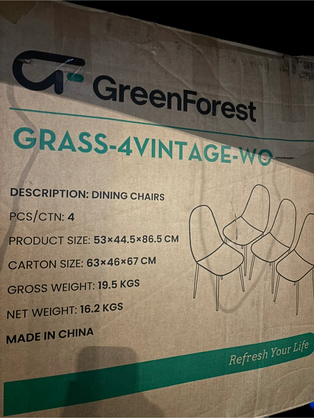Set of 4 GreenForest dining chairs in the GRASS-4VINTAGE-WO model. Product size is 53x44.5x86.5 cm. Made in China.