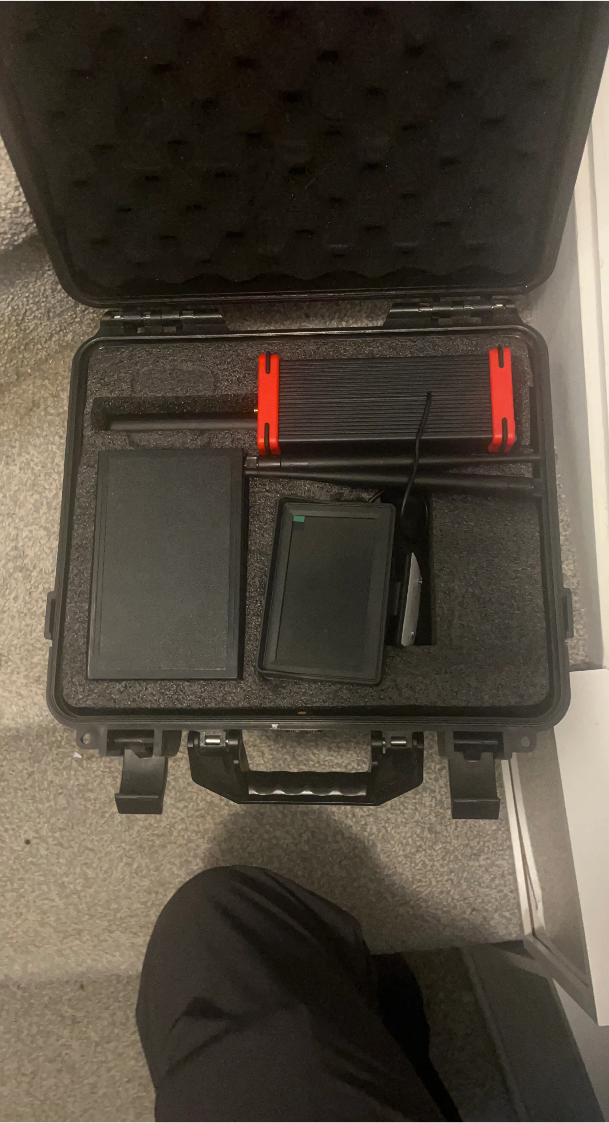 This is a complete wireless video transmitter and receiver system. It includes a portable monitor and two antennas. The unit comes in a protective hardshell case. This system is useful for remote monitoring applications.