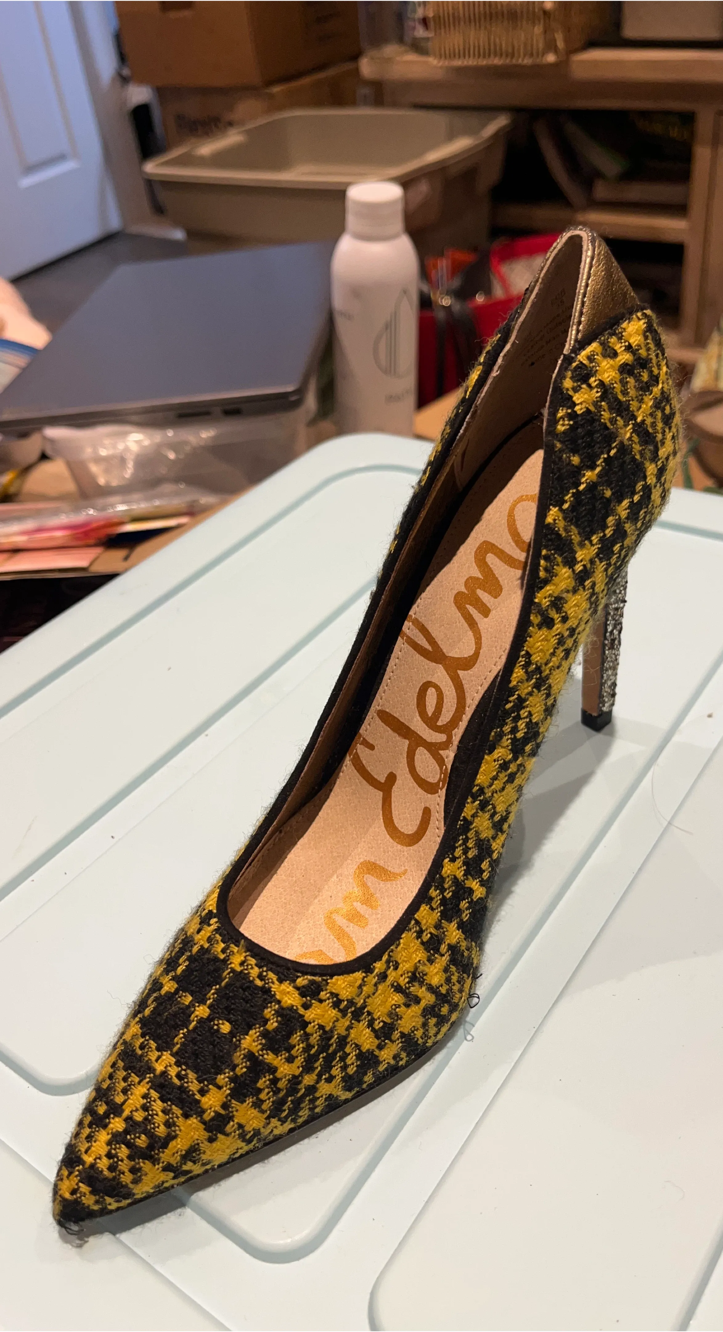 These are stylish Sam Edelman heels featuring a yellow and black plaid pattern. The shoes have a pointed toe and a glitter detail on the heel. Fabric outer with a leather sole.