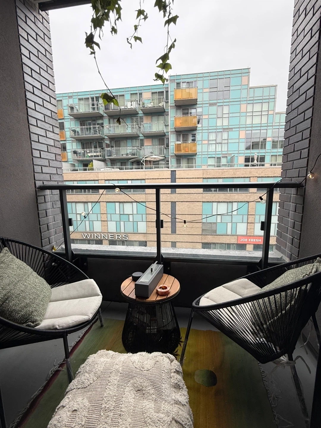 2 chairs & a small table with storage. Beautiful black woven material perfect for a small balcony or outdoor space.