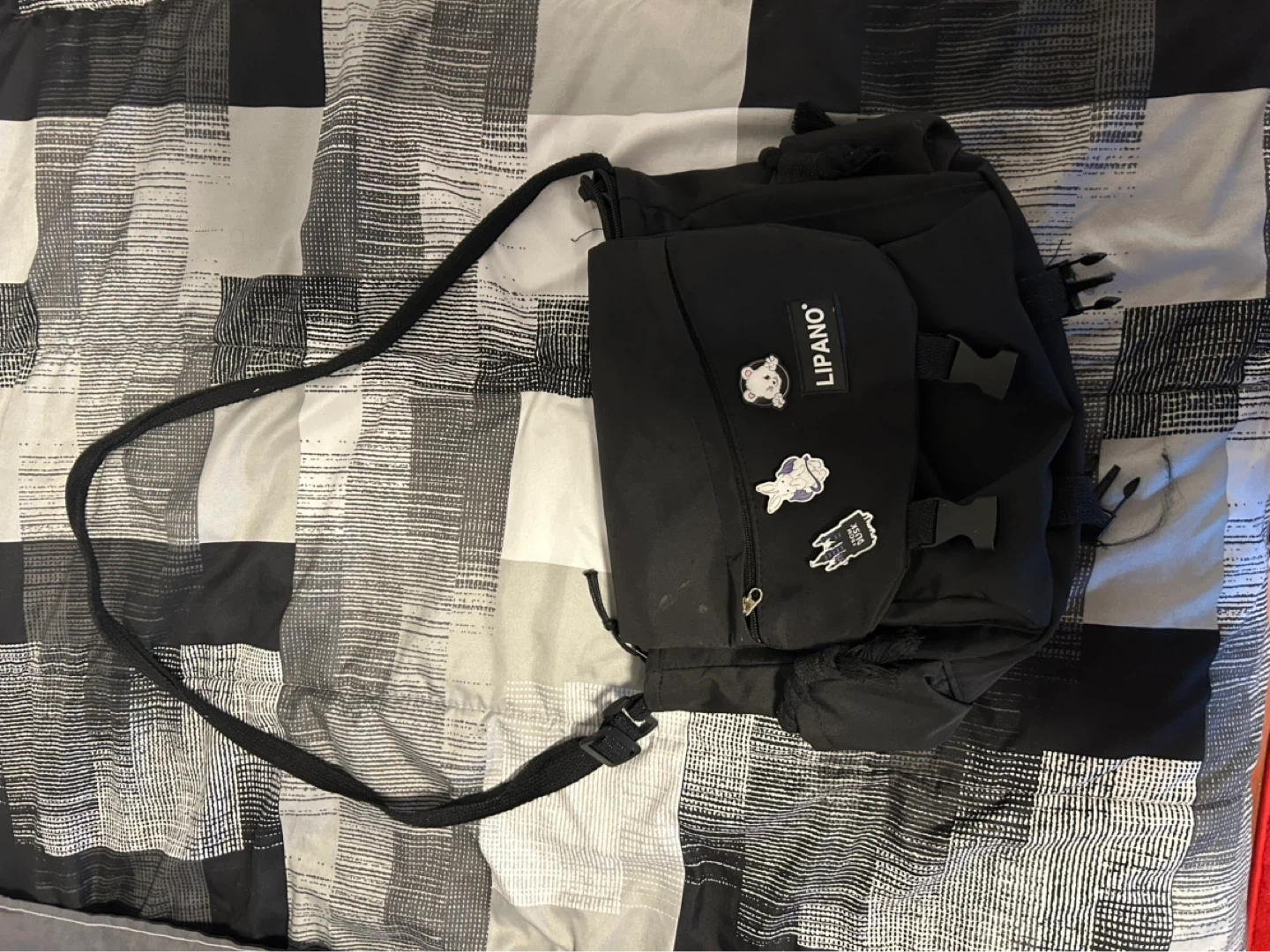 A black Lipano backpack with decorative pins on the front. It has adjustable straps and multiple compartments for storage. Perfect for daily use and carrying essentials. Broken zipper but still usable and secure.