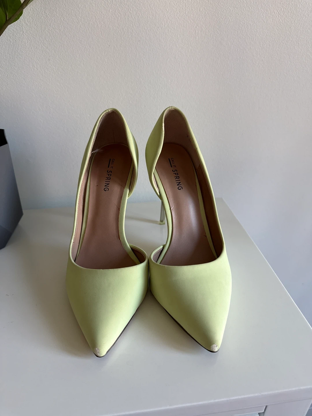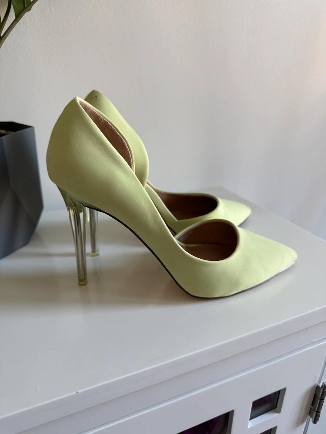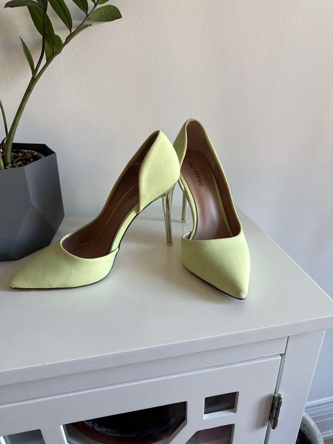 These light green heels are from Call It Spring. They feature a stylish d'Orsay cut and clear block heels. Perfect for adding a pop of colour to any outfit!