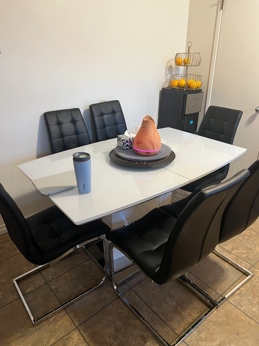 Selling a modern dining table with six chairs. The table is white and extendable, perfect for accommodating extra guests. The chairs are black with a quilted pattern and chrome legs. It's in great condition and ready for a new home!