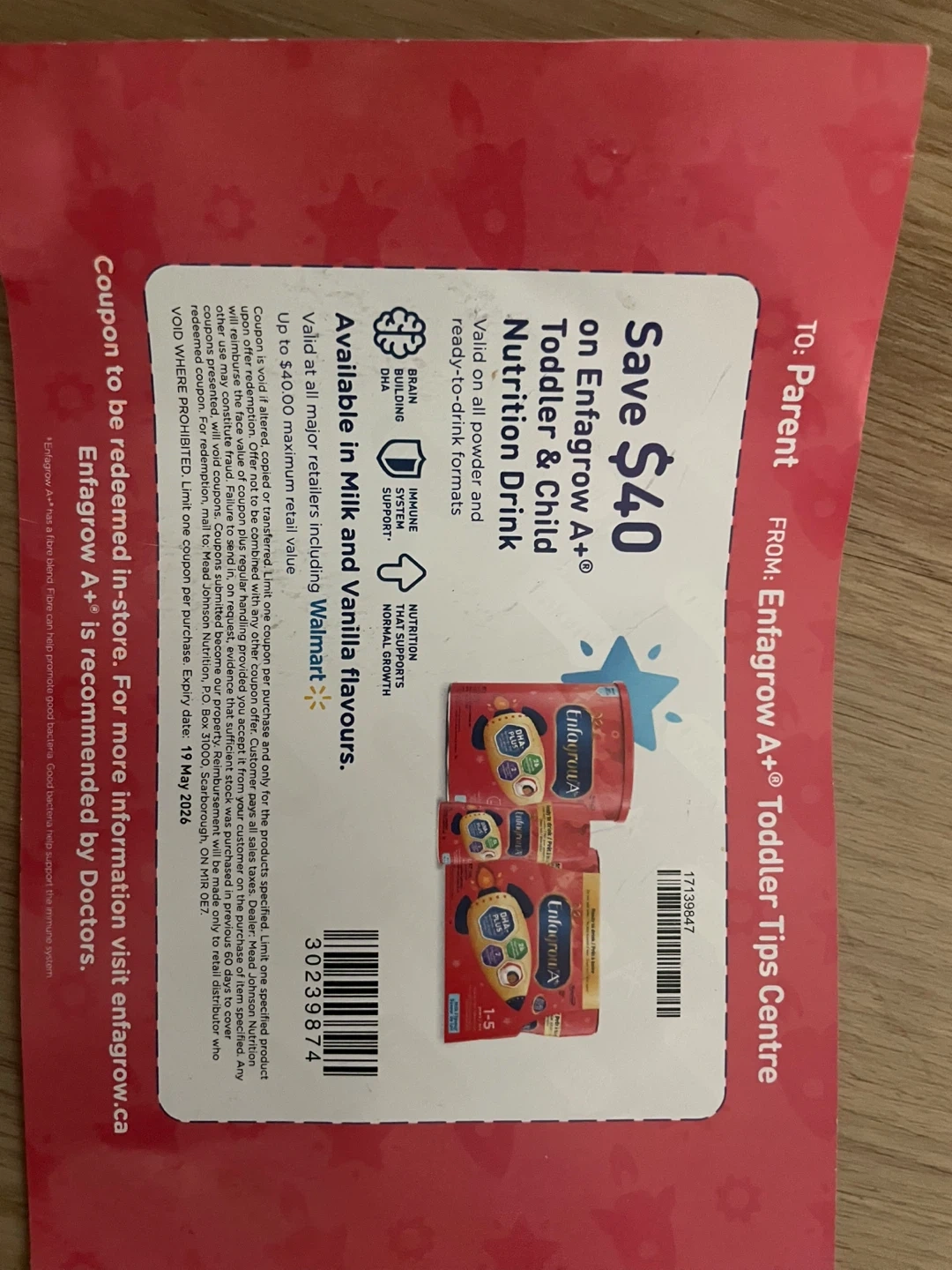 This coupon offers $40 off Enfagrow A+ Toddler & Child Nutrition Drink in powder and ready-to-drink formats. Available in Milk and Vanilla flavours. Expiry date is 19 May 2026. Valid at major retailers including Walmart.