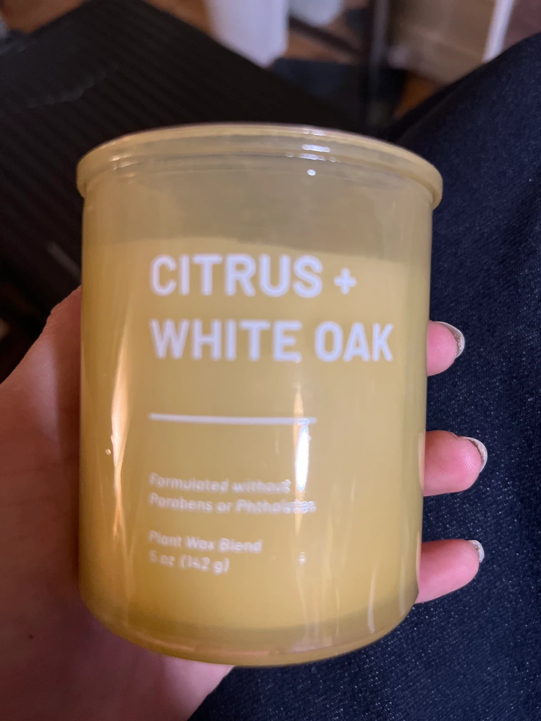 Selling a Citrus + White Oak candle! It's a 5 oz plant wax blend candle. Formulated without Parabens or Phthalates