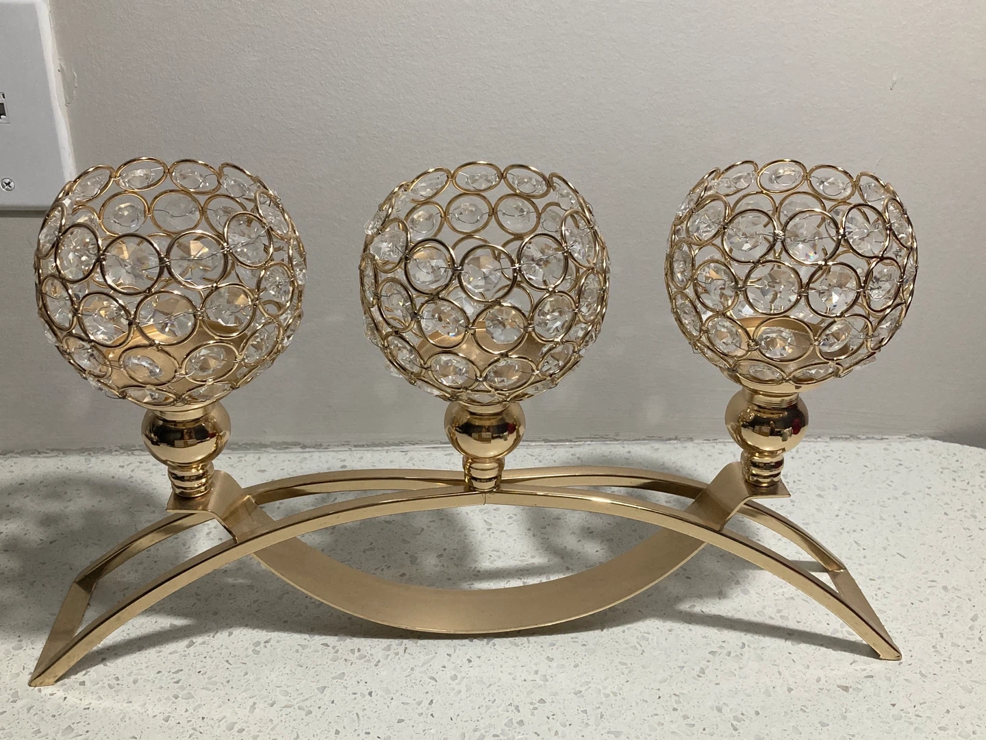 This is a three-candle candelabra with a gold finish and crystal accents. It's designed to hold three pillar or votive candles. Adds a touch of elegance to any space!