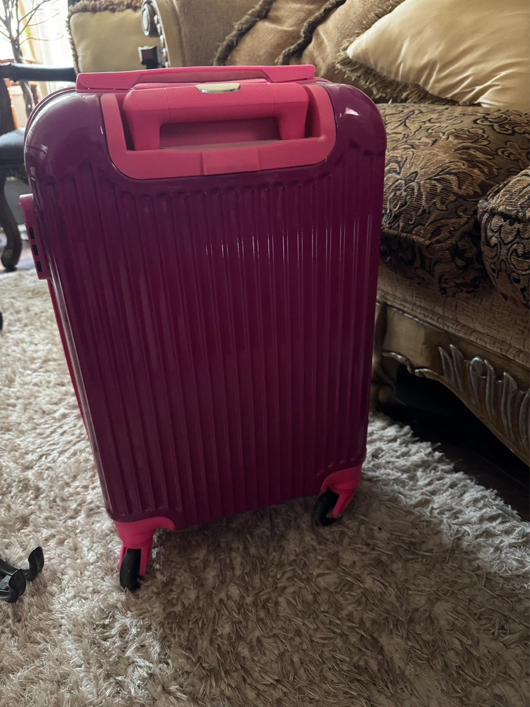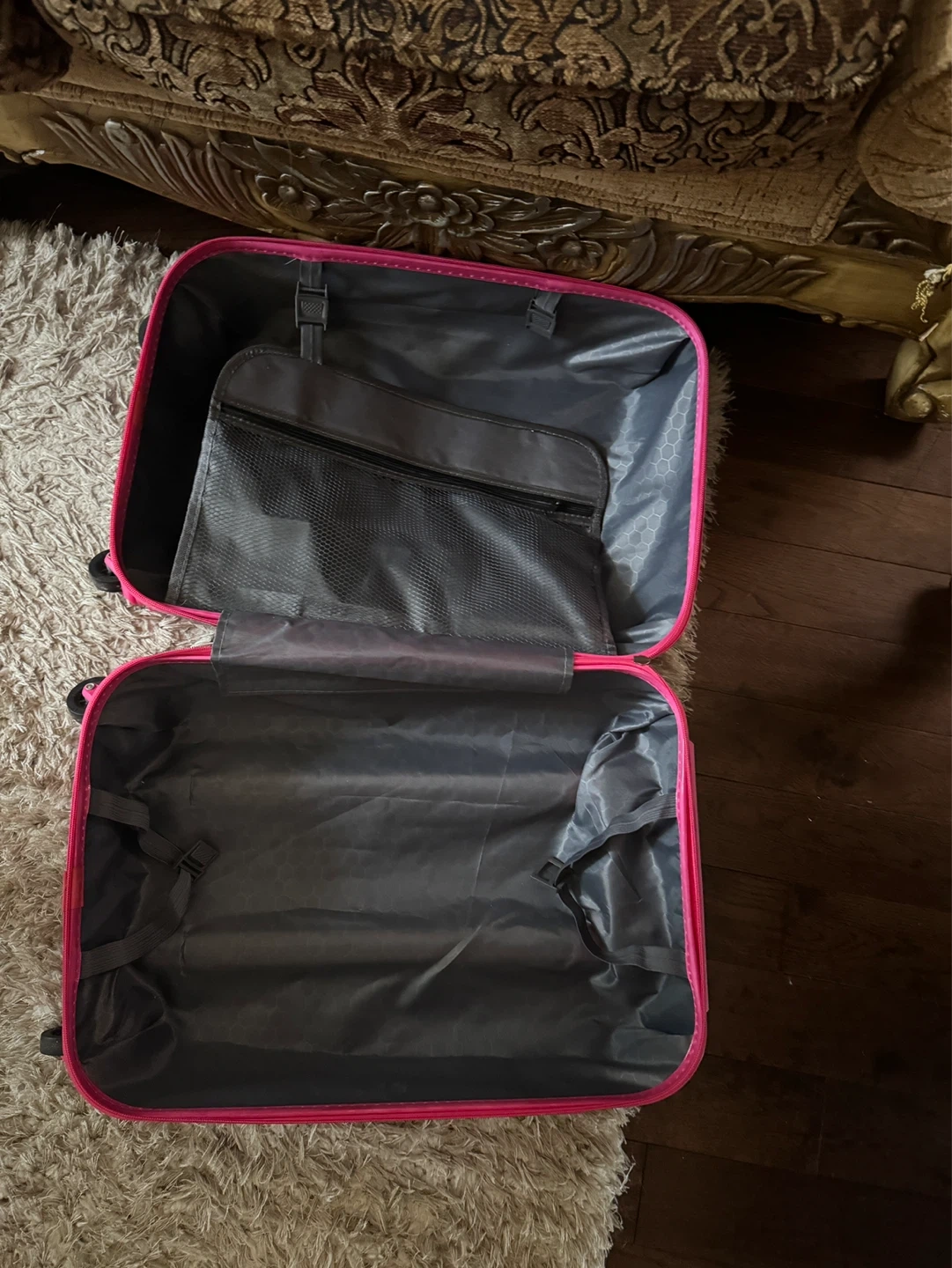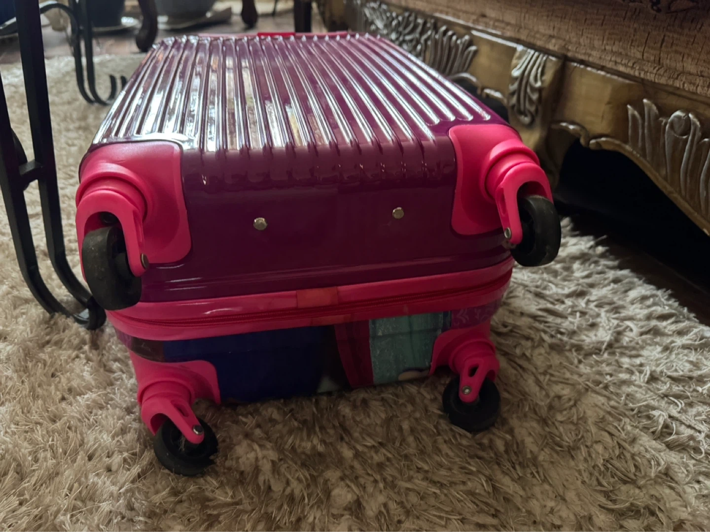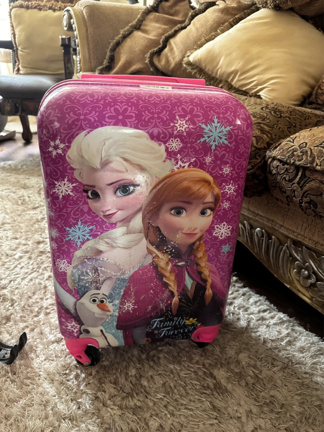 This is a kids' rolling suitcase/ carry-on luggage. It features characters from Disney's Frozen. It has a hard shell with a pink and purple design. The interior is grey with straps to secure belongings. Perfect for little travellers!
