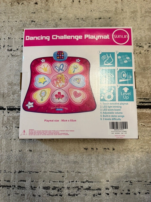 Get ready to bust a move with this Sunlin Dance Mat! It's a touch-sensitive playmat with LED lights, an LED score board, adjustable volume, and built-in demo songs. With 3 levels of difficulty, it's perfect for kids aged 3+. Key features include: Touch sensitive playmat, LED light blinking, LED score board, Adjustable volume, Built-in demo songs, 3 levels difficulty. This mat is practically brand new, still in its original packaging, ready to bring some fun into your home. Comparable items are listed on Kijiji for around $40, and I am offering it for a reasonable price, considering its condition. If you see this ad, the dance-off is still on!