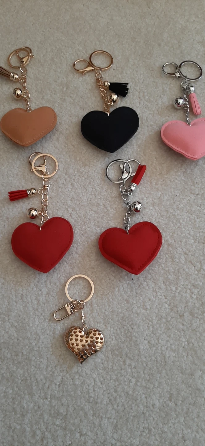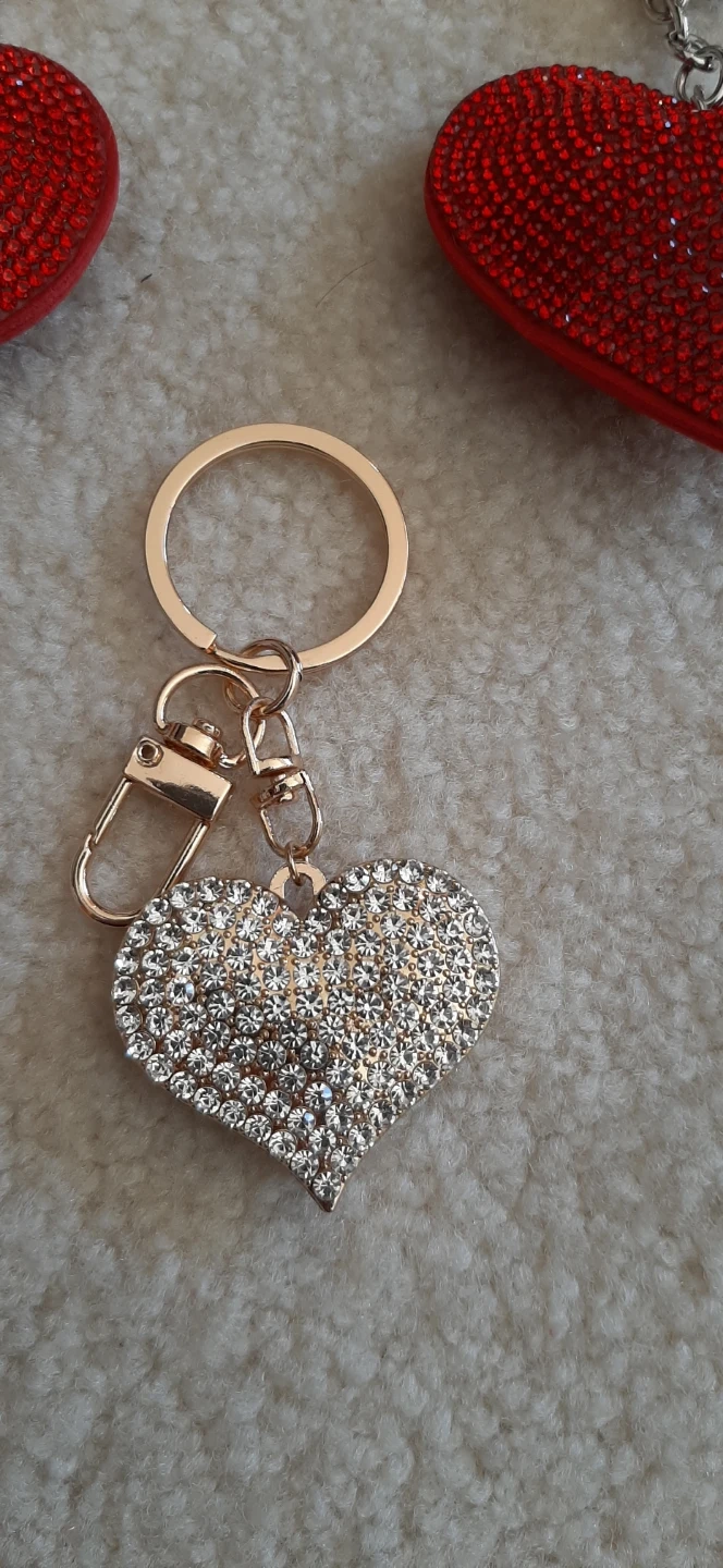 Cute heart shaped keychains with rhinestones! They come in a variety of colors including red, pink, gold, and black.