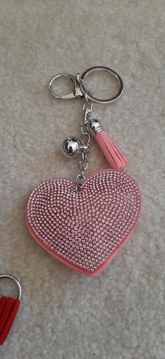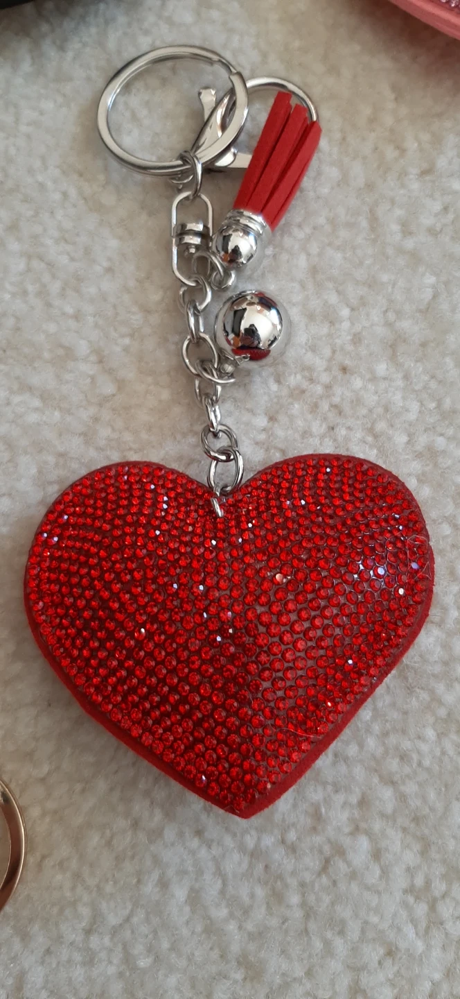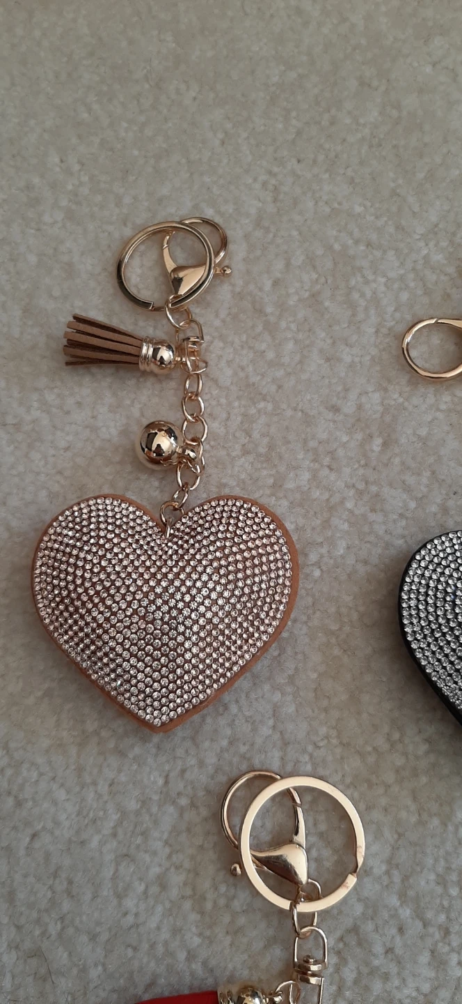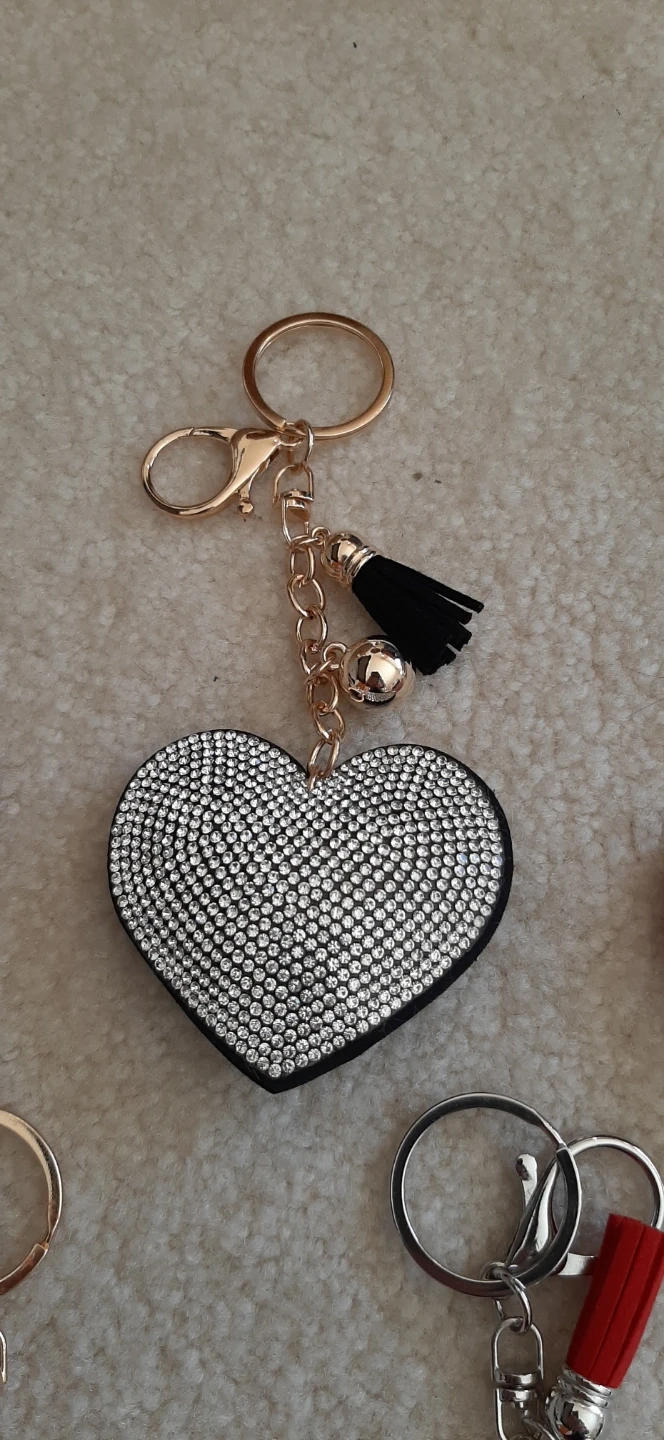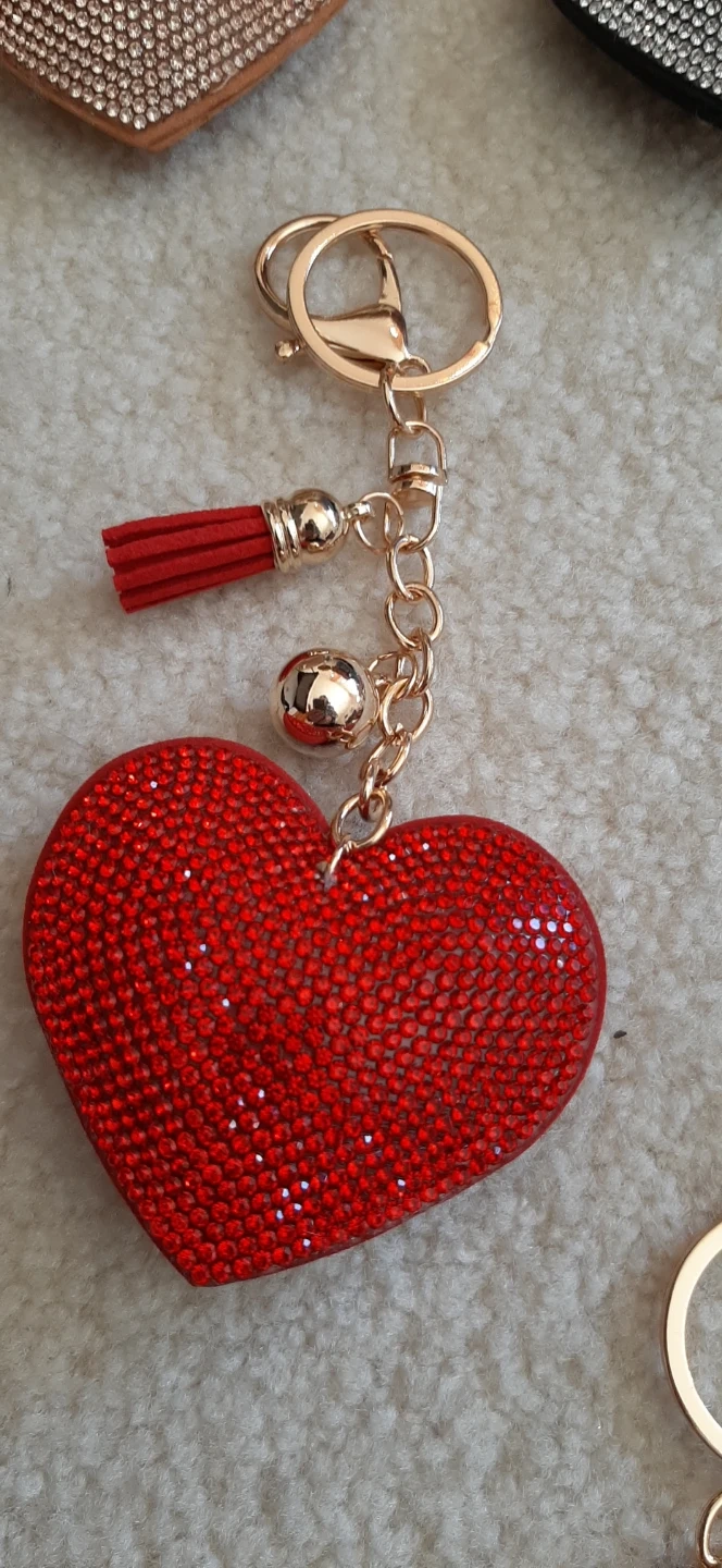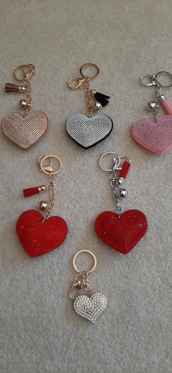 Cute heart shaped keychains with rhinestones! They come in a variety of colors including red, pink, gold, and black.