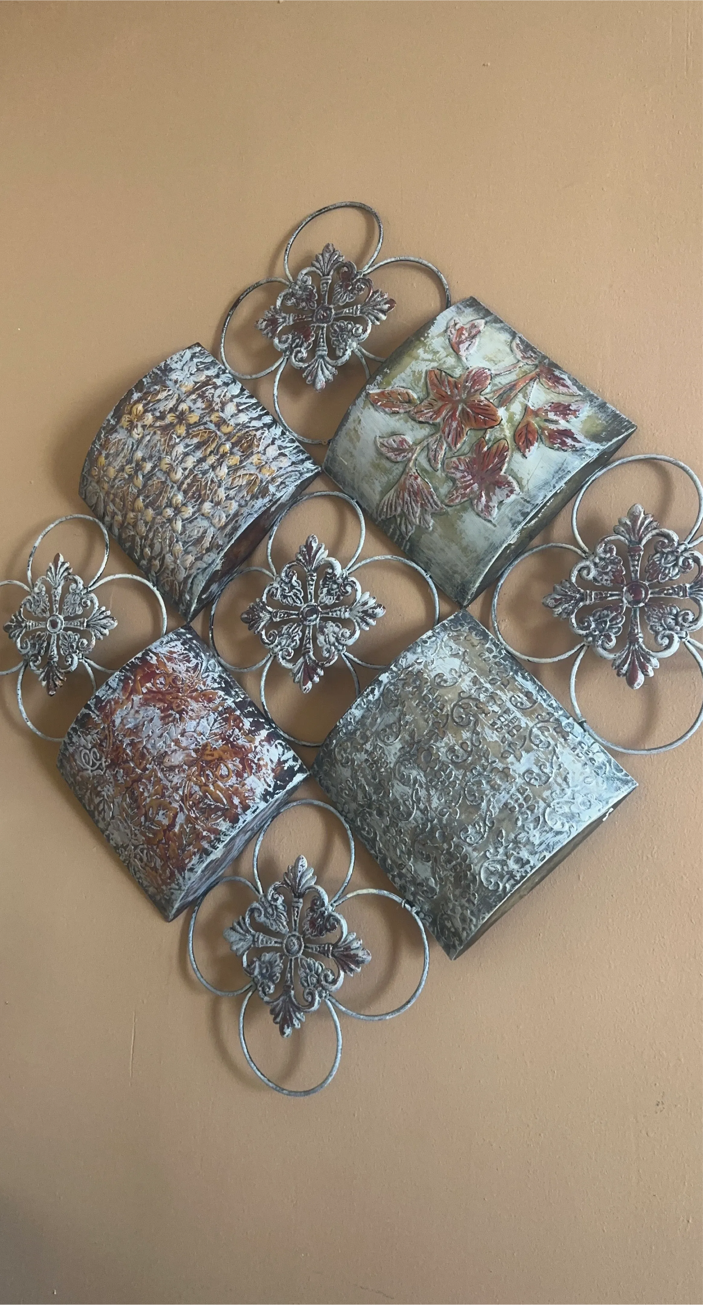 This decorative metal wall art features a diamond pattern with distressed finishes and floral accents. Its intricate design adds a touch of elegance to any room. Metal construction.