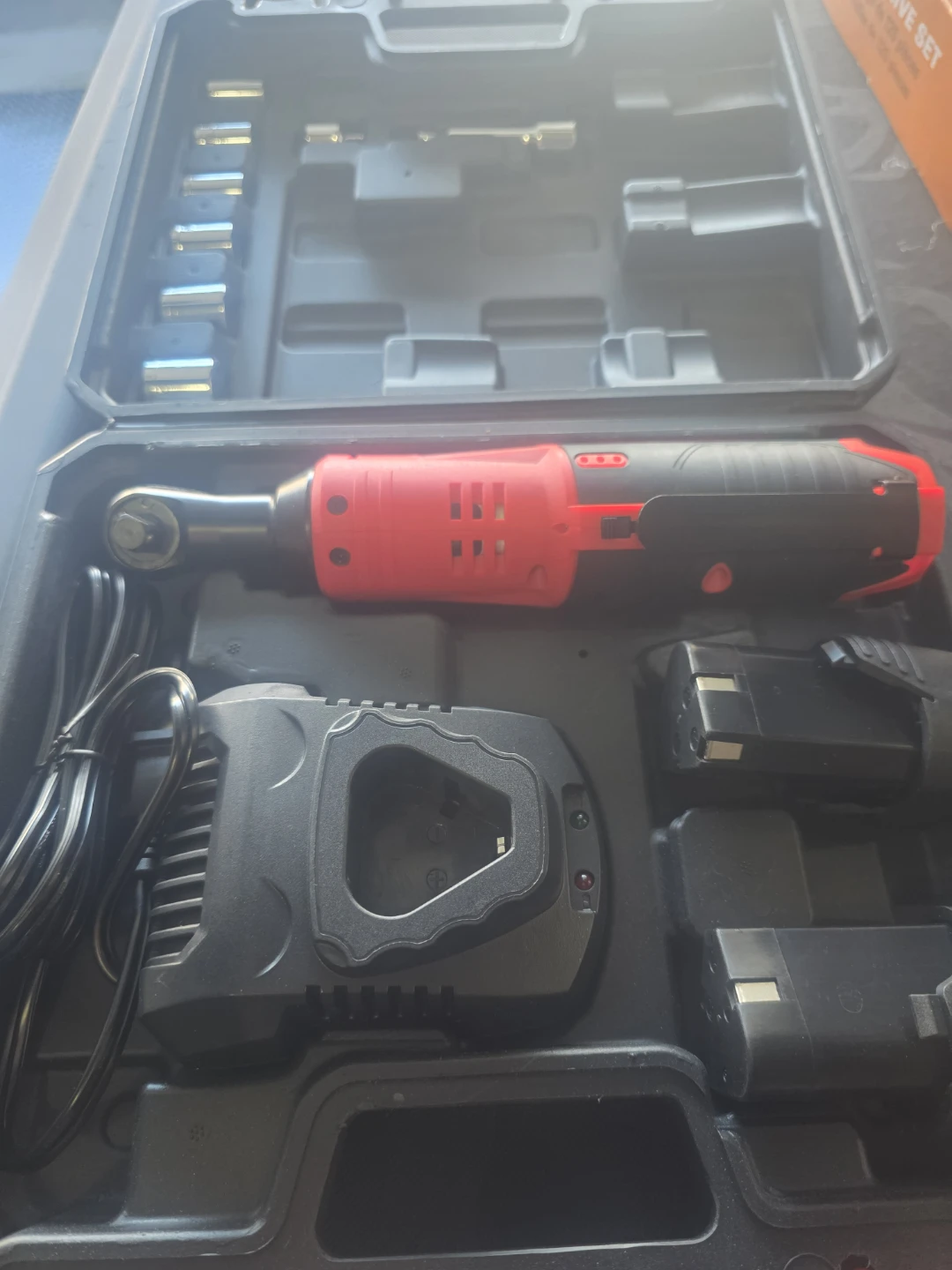 This is a cordless ratchet wrench set. It comes with a charger and two batteries. The set includes sockets and is housed in a black and red case.