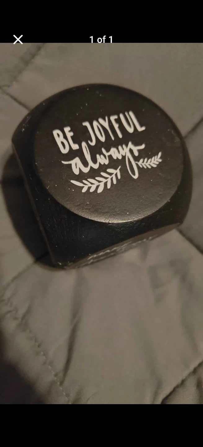 This decorative block features the phrase "Be Joyful Always" in a white script font with small leafy accents. It's black with a matte finish. It's a great little accent piece for any shelf or surface! Motivational dice
