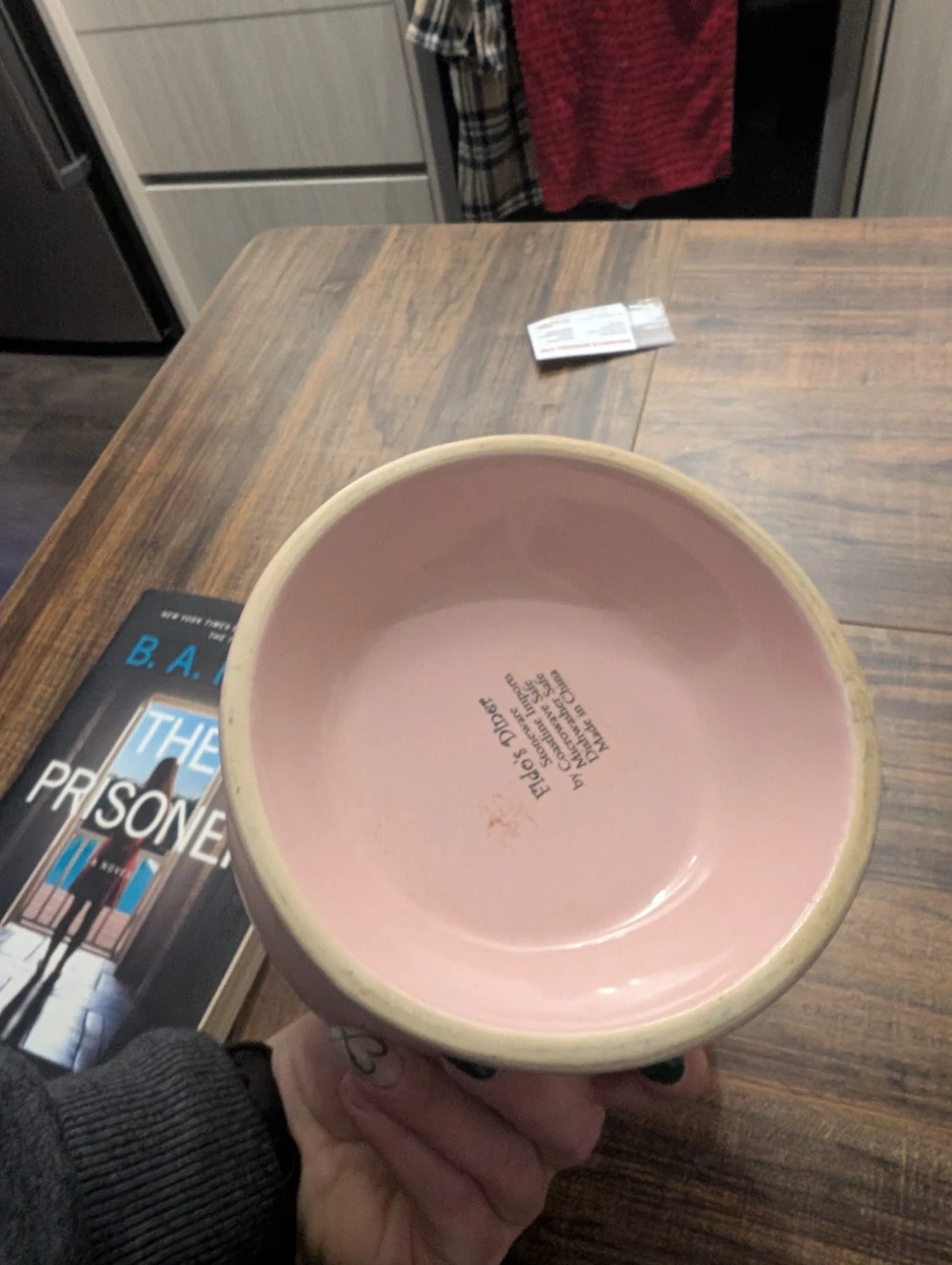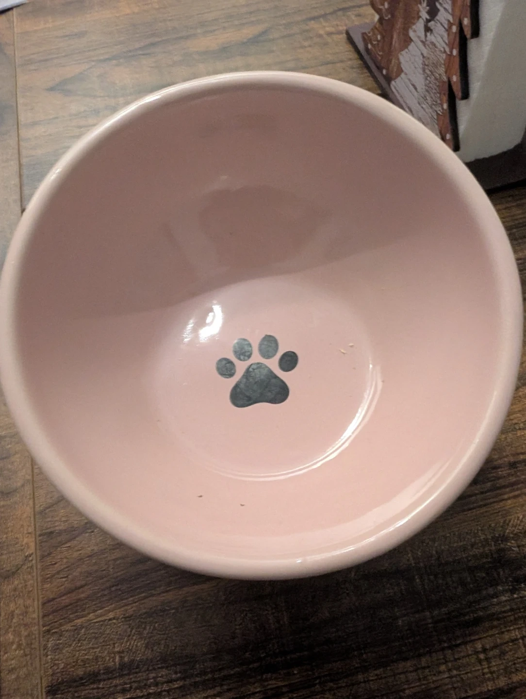 This is a pink ceramic pet bowl featuring a paw print design. It's designed to be a comfortable height for pets. Great for serving food or water to your furry friend!