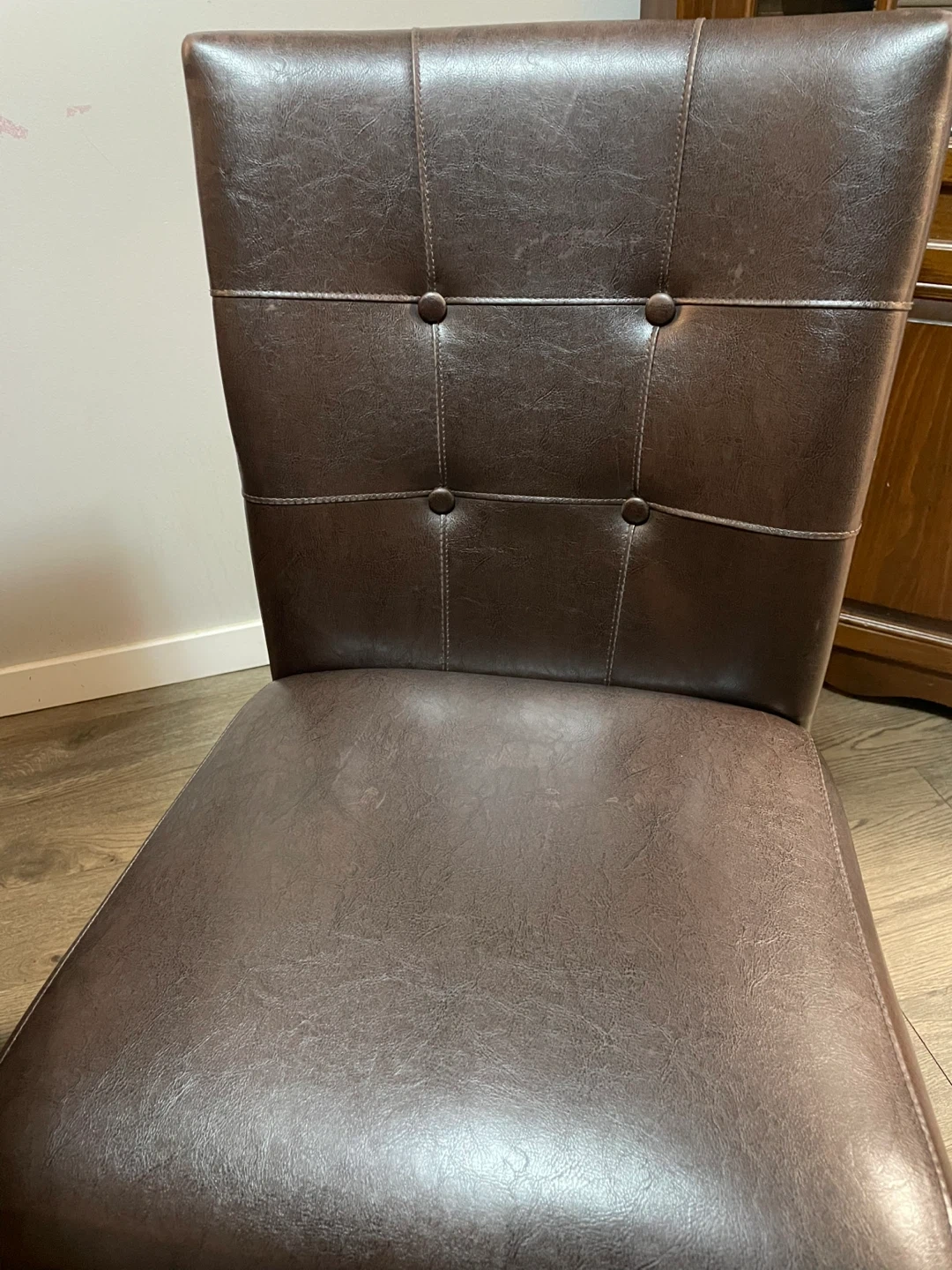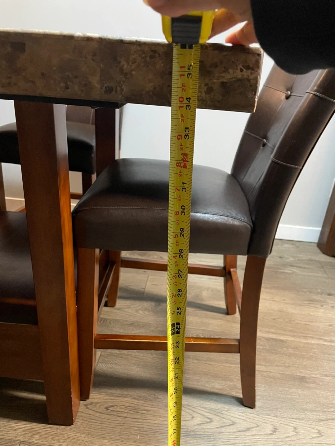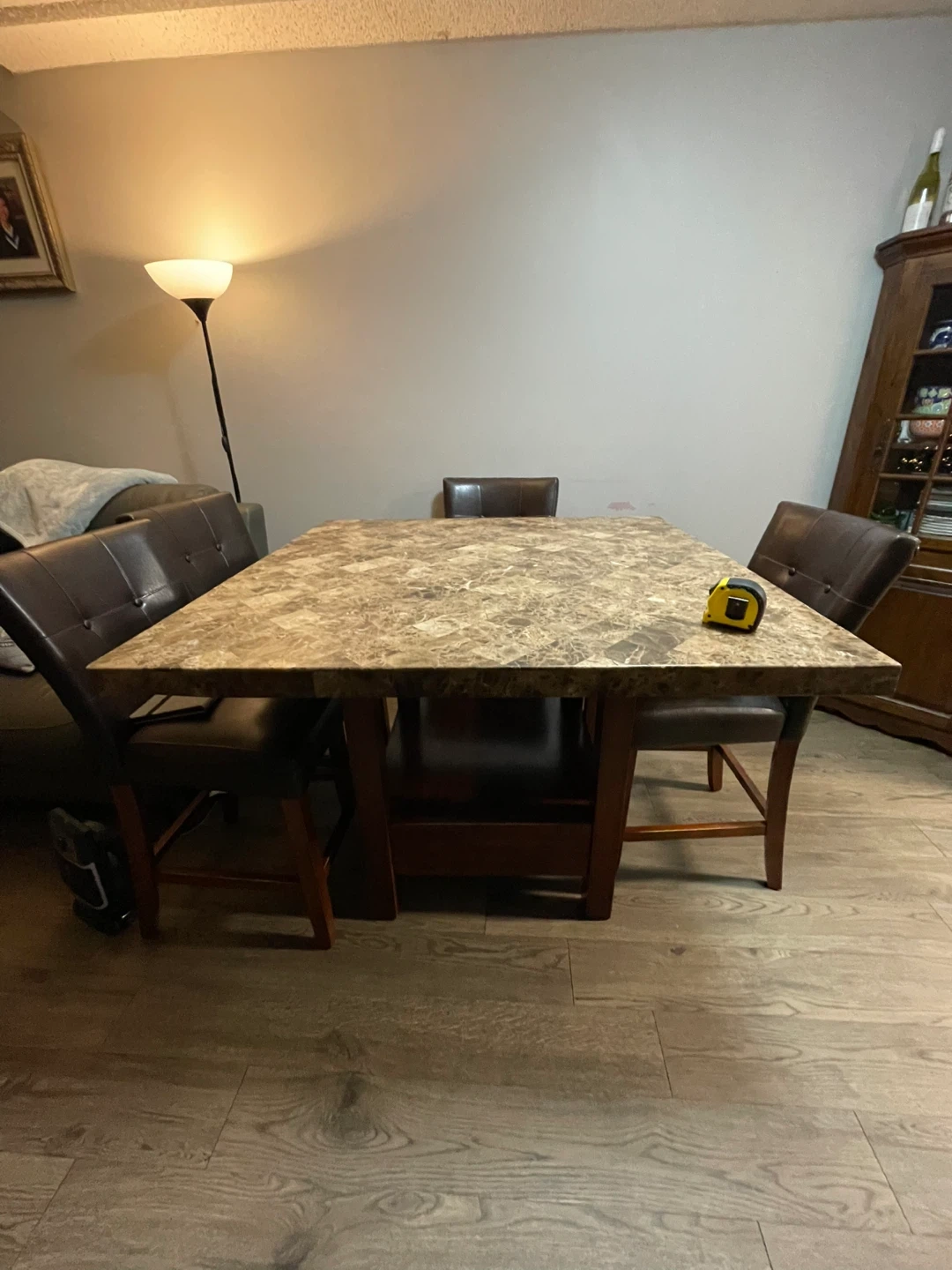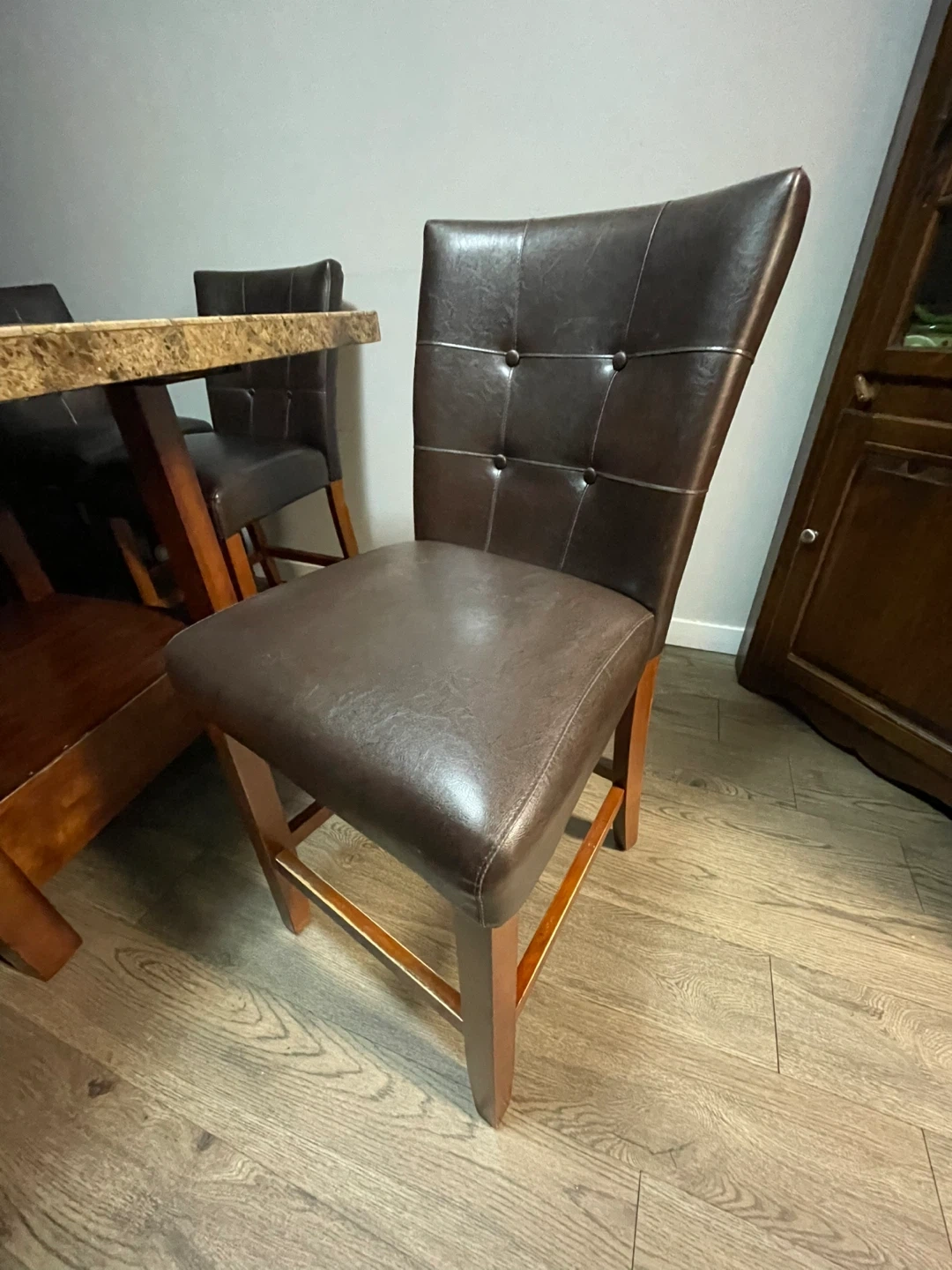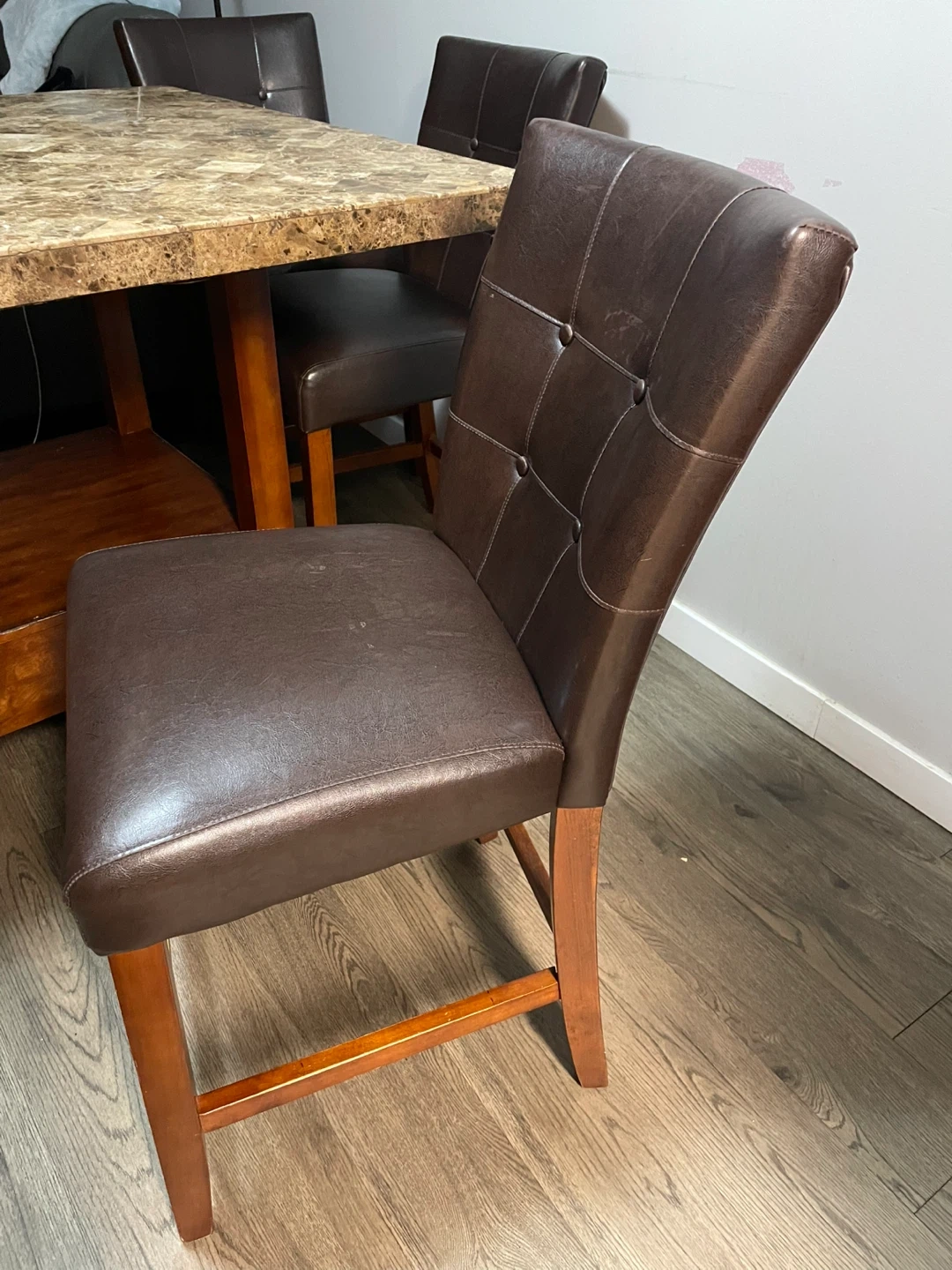 This dining set includes a table with a marble-look top and four upholstered chairs. The chairs are brown faux leather with tufted backs. The table has a wood base with a hidden drawer. This set is great for family dinners or entertaining guests!