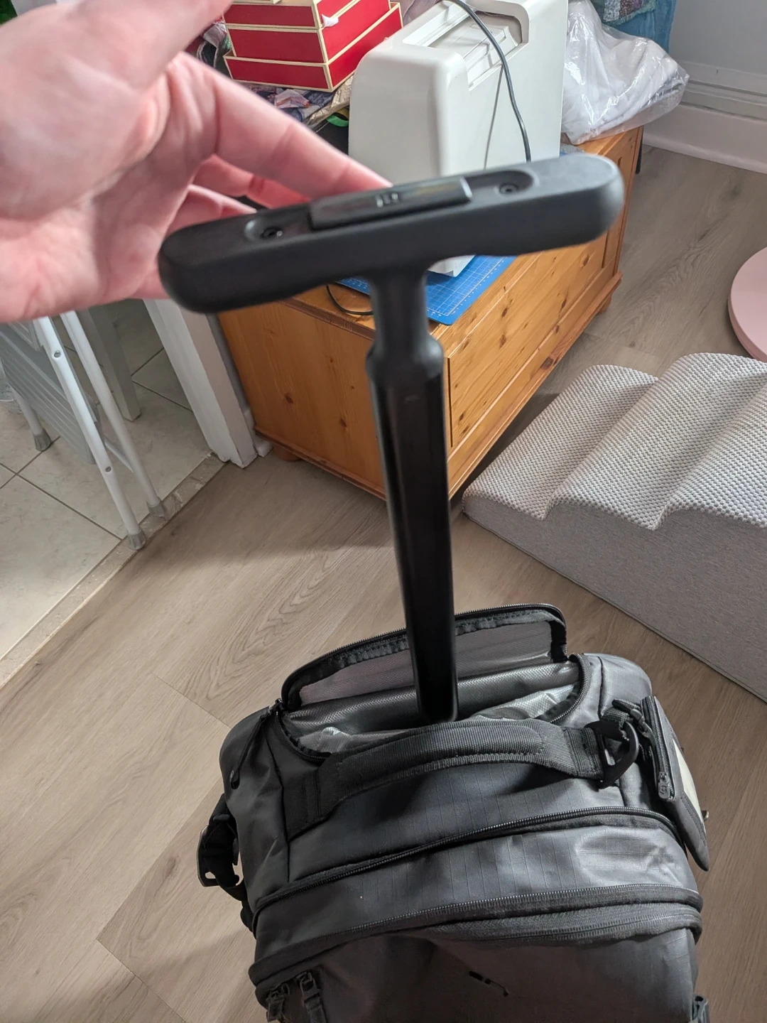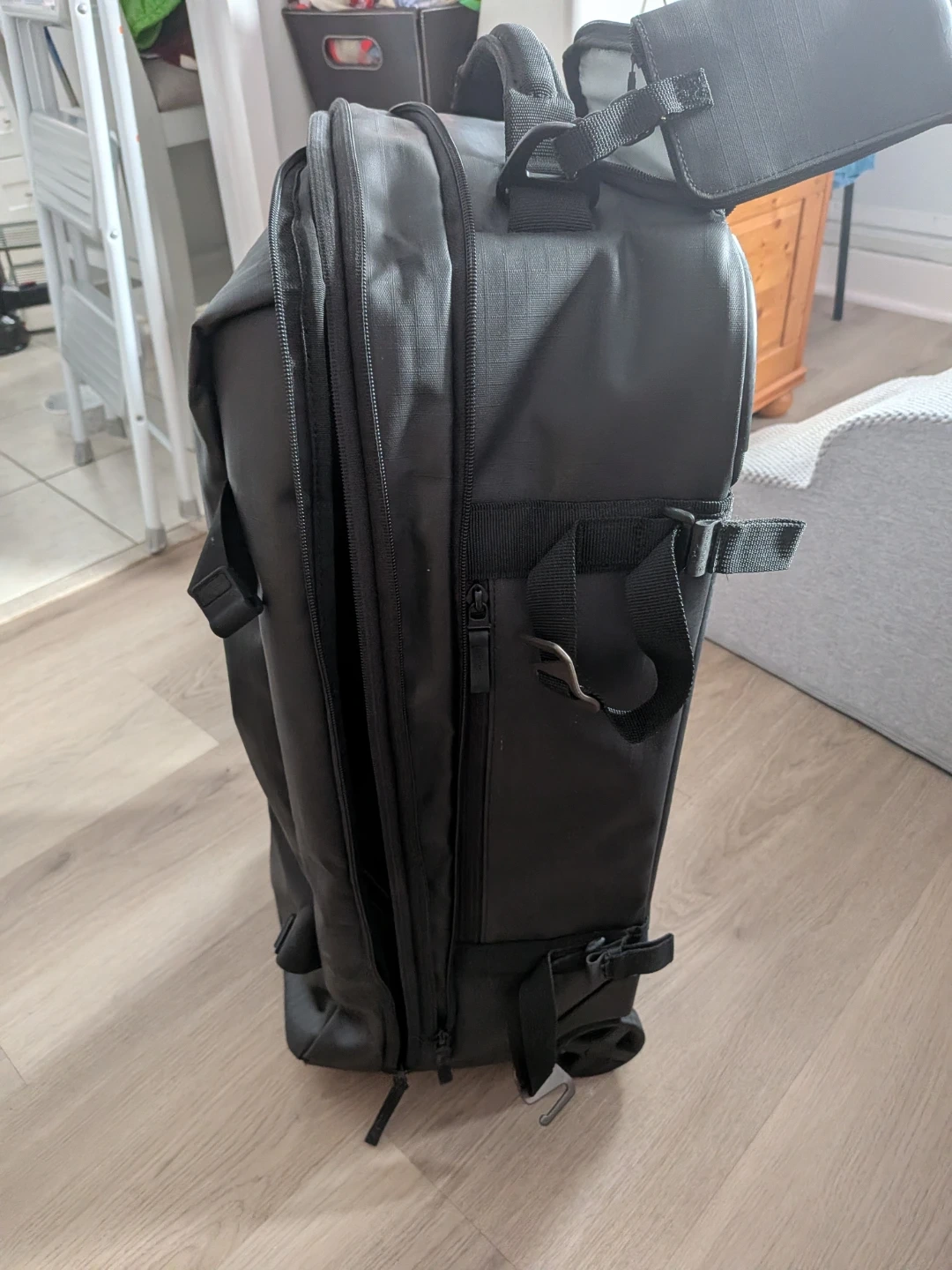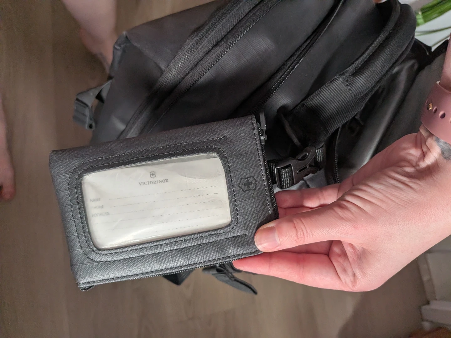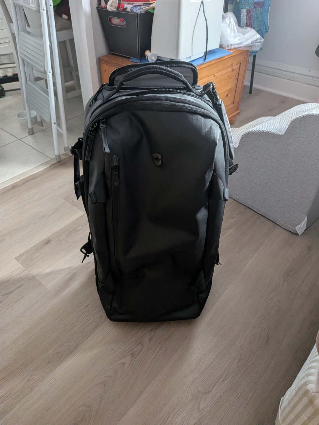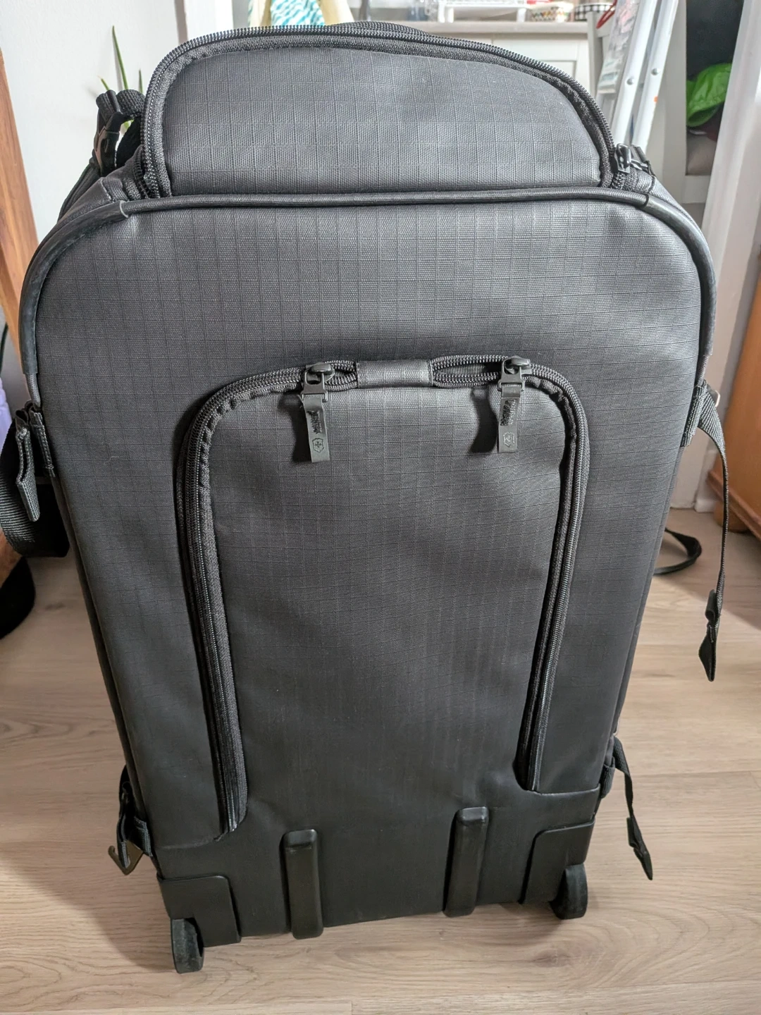 This is a Victorinox black rolling travel suitcase. It's made of durable, water-resistant material. Features include a retractable handle that has a cover zip when not in use and a zip out expansion section to hold extra stuff.