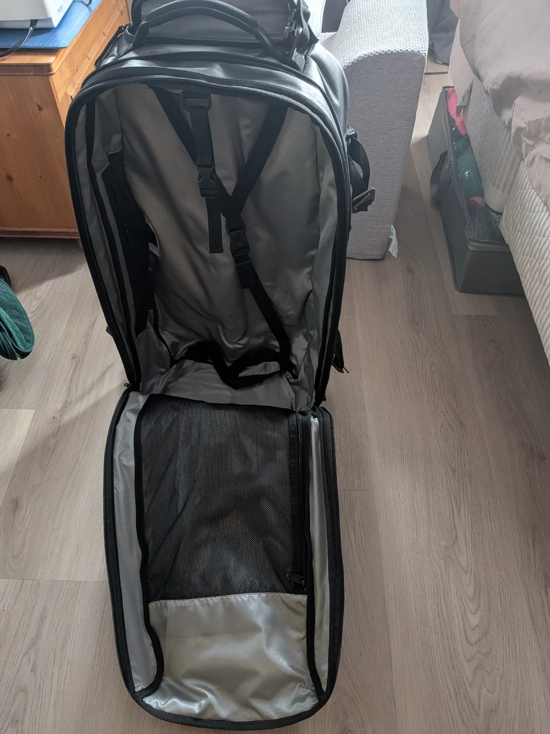 This is a Victorinox black rolling travel suitcase. It's made of durable, water-resistant material. Features include a retractable handle that has a cover zip when not in use and a zip out expansion section to hold extra stuff.