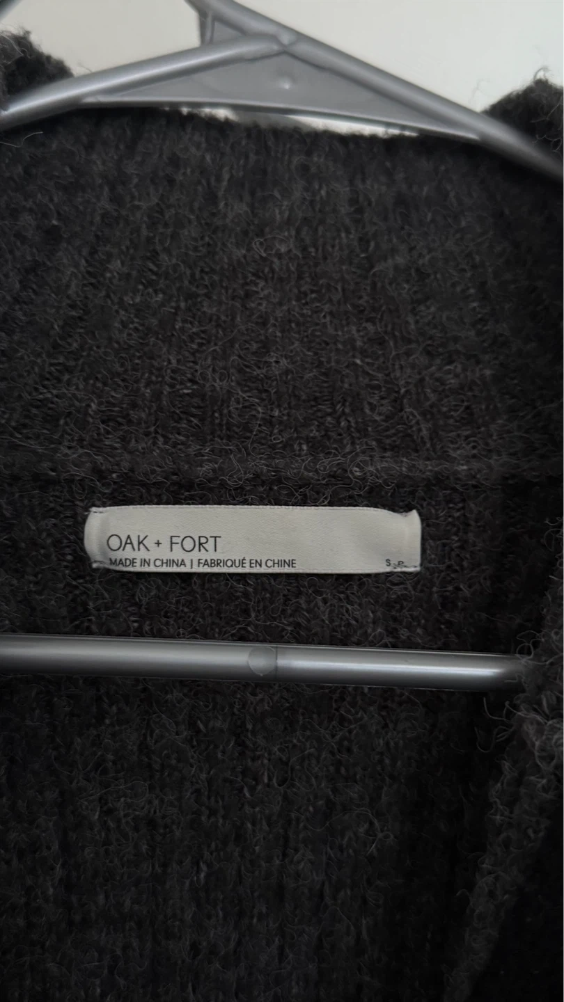 This is an Oak + Fort cropped sweater in a dark grey colour. It's made in China and is a size small. Features a ribbed knit design and a half-zip neckline.
