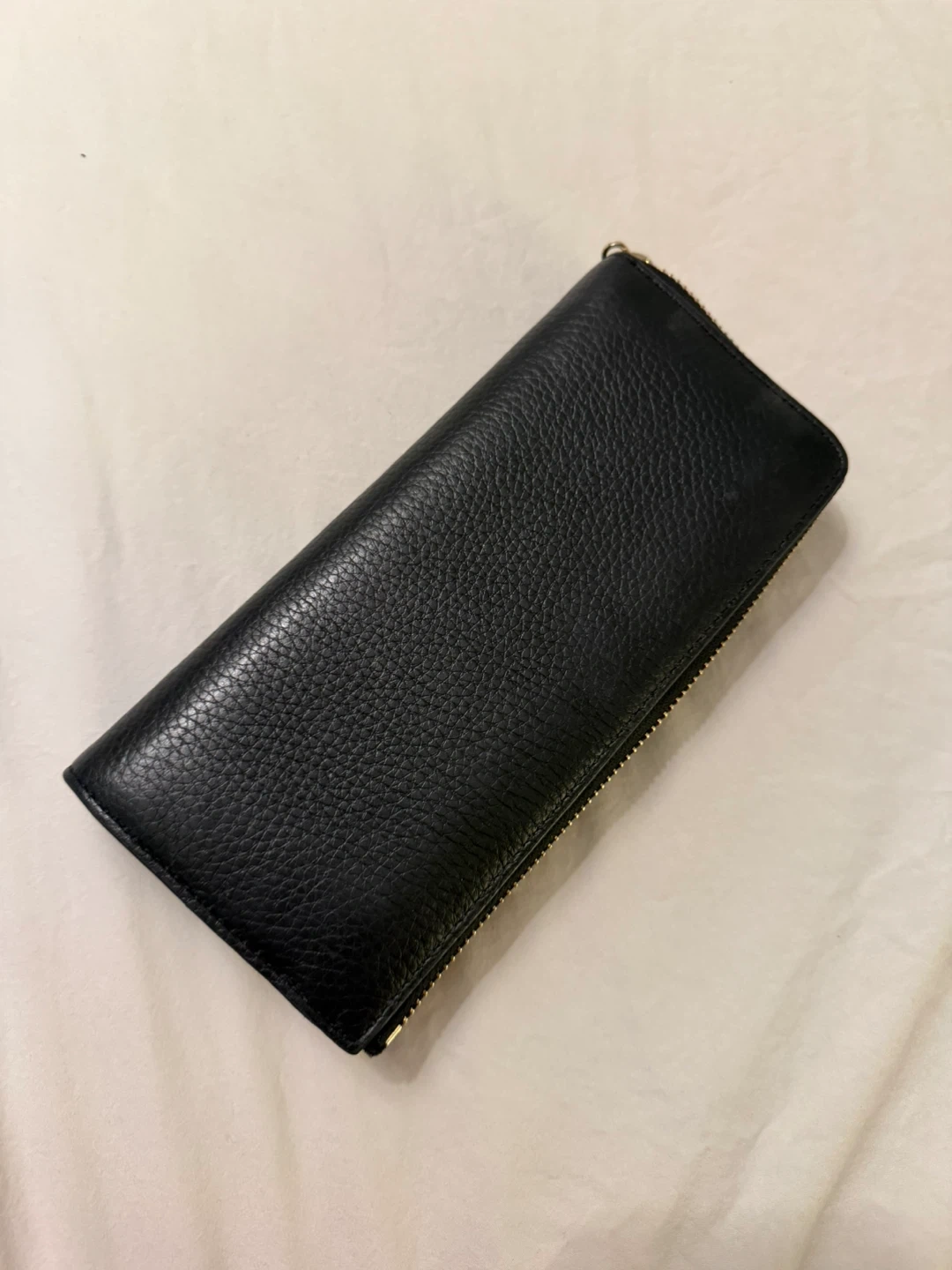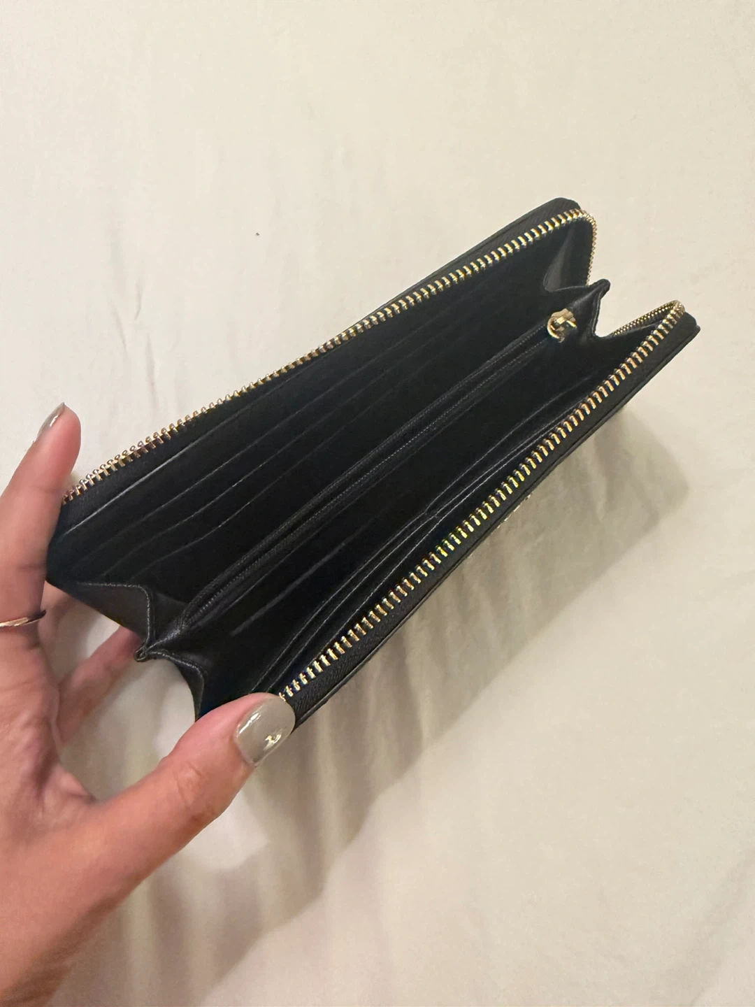 This is a Michael Kors zip-around wallet in black leather. It has multiple card slots and a zippered coin pocket inside. The gold-tone hardware adds a touch of class. It's a great wallet for keeping your essentials organized!