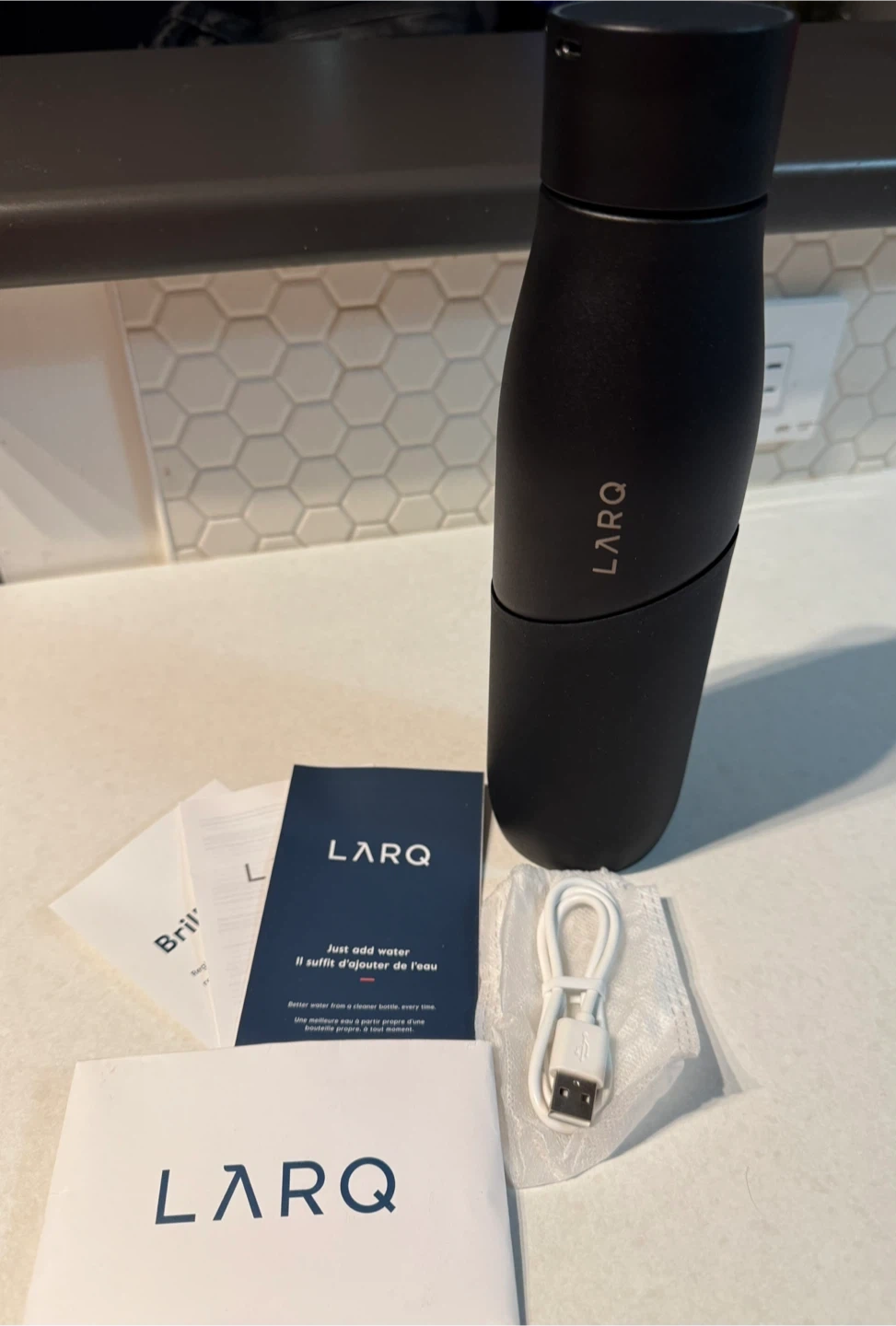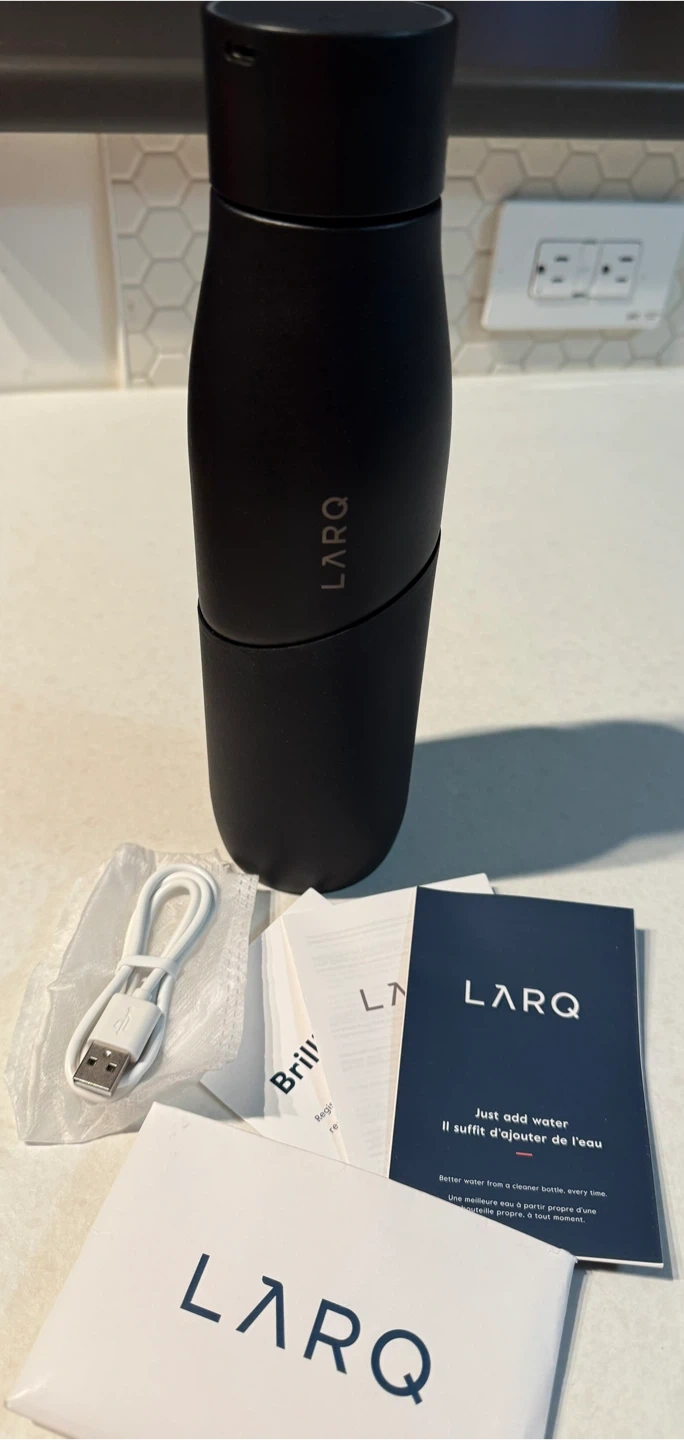 I'm selling a 710ml/24 oz LARQ self-sanitizing water bottle in onyx black! It’s brand new without the box, comes with all included components, such as the charger and instructions. It's perfect for staying hydrated and healthy on the go! Just add water and enjoy a cleaner bottle every time