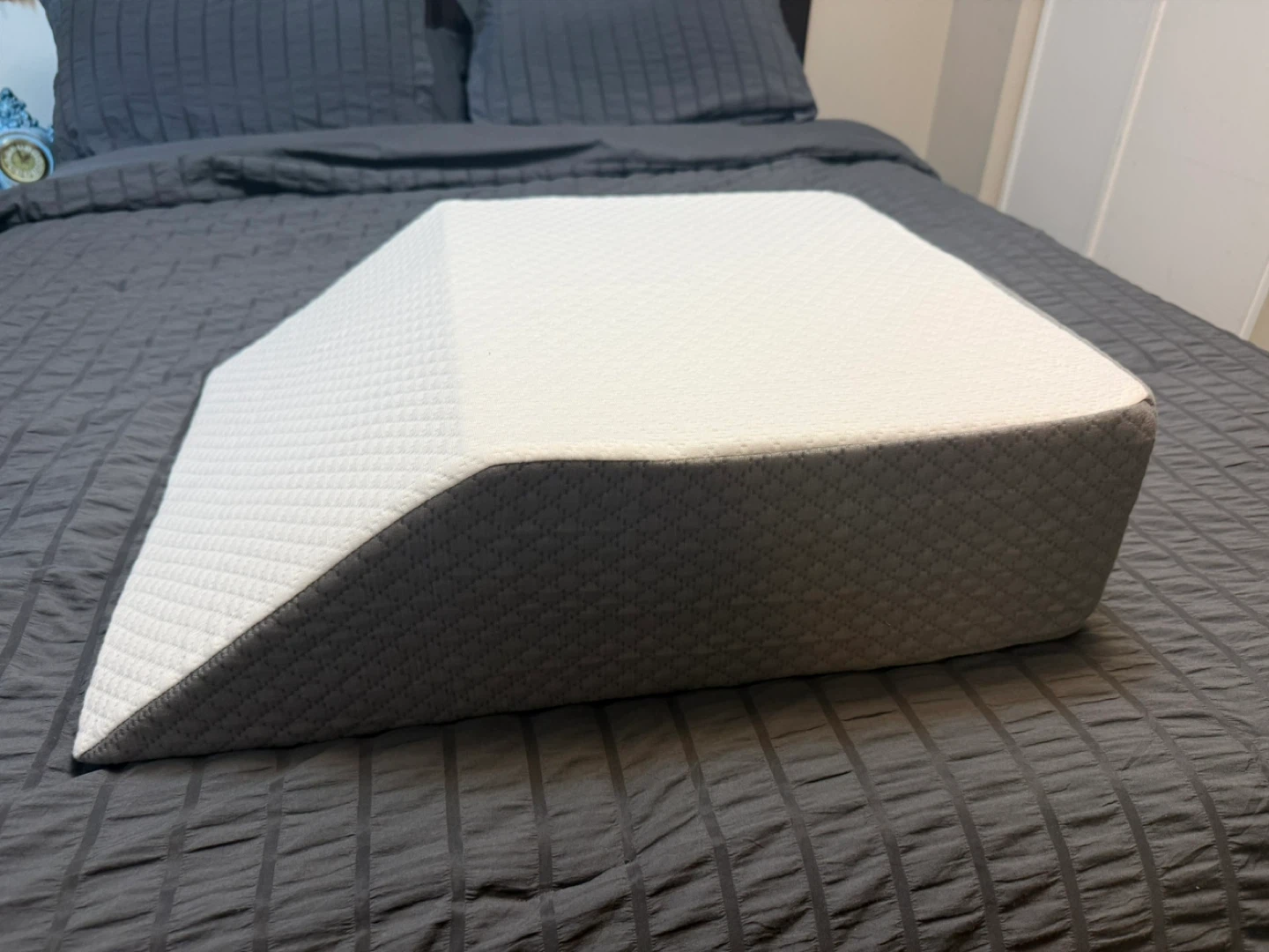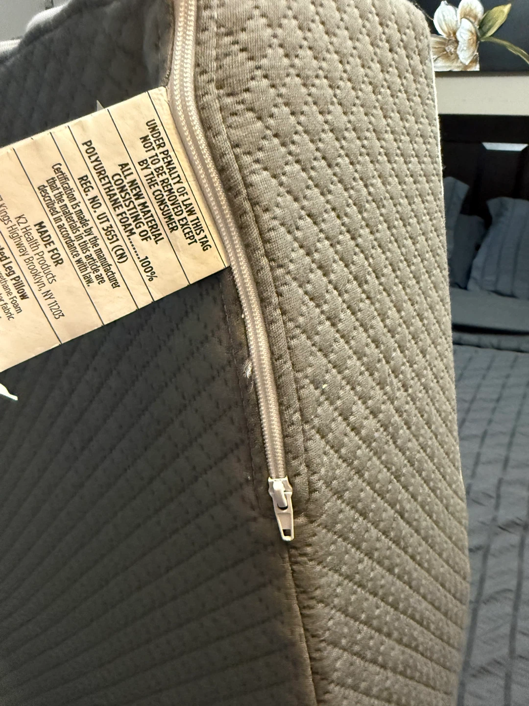 This is an elevated leg pillow. Core is 100% Polyurethane Foam. Outer shell is 100% Polyester fabric. Finished size is 24 x 19 x 7 inches. Useful for elevating legs after surgery or for comfort. Smoke free home. Brand new item. Pick up in Welland.
