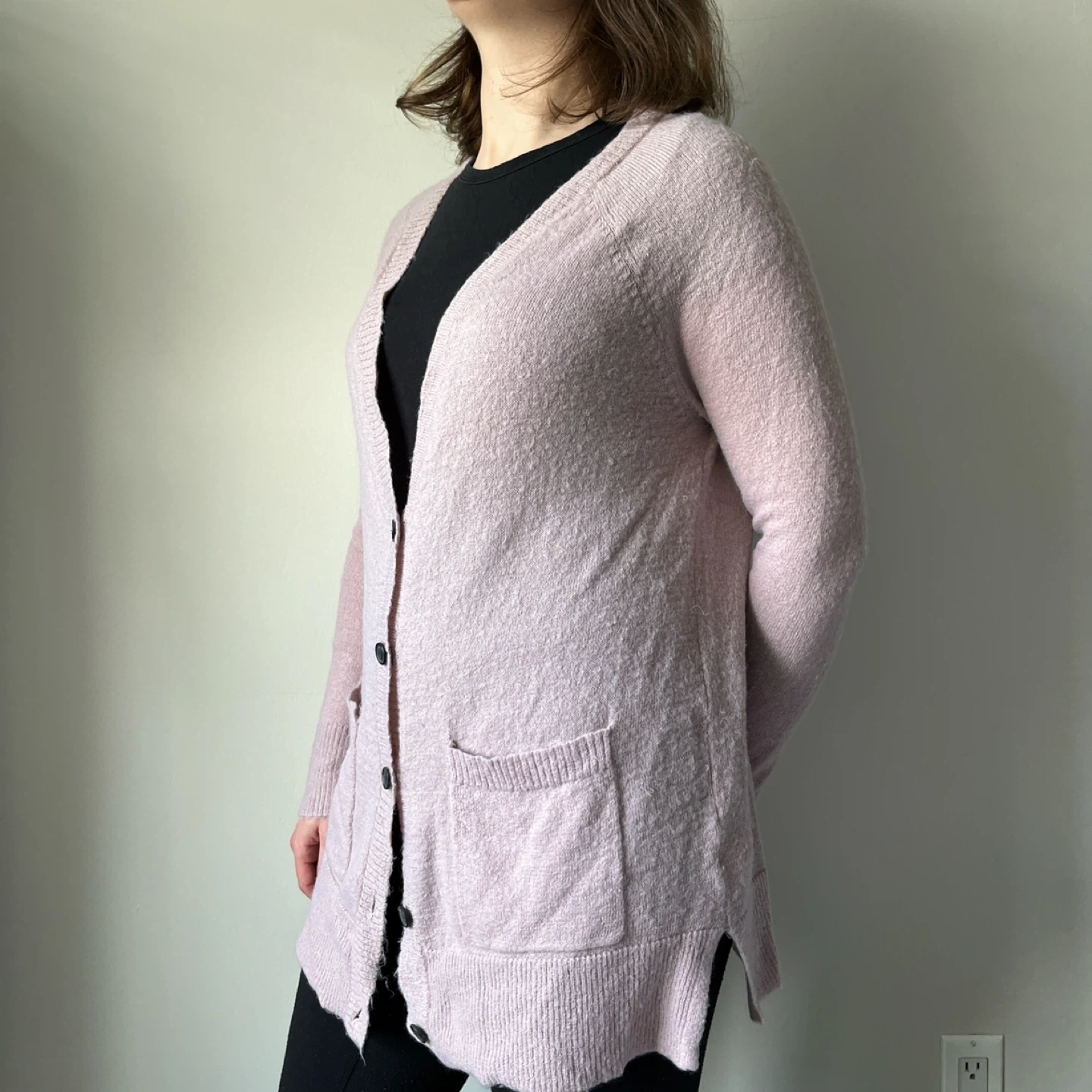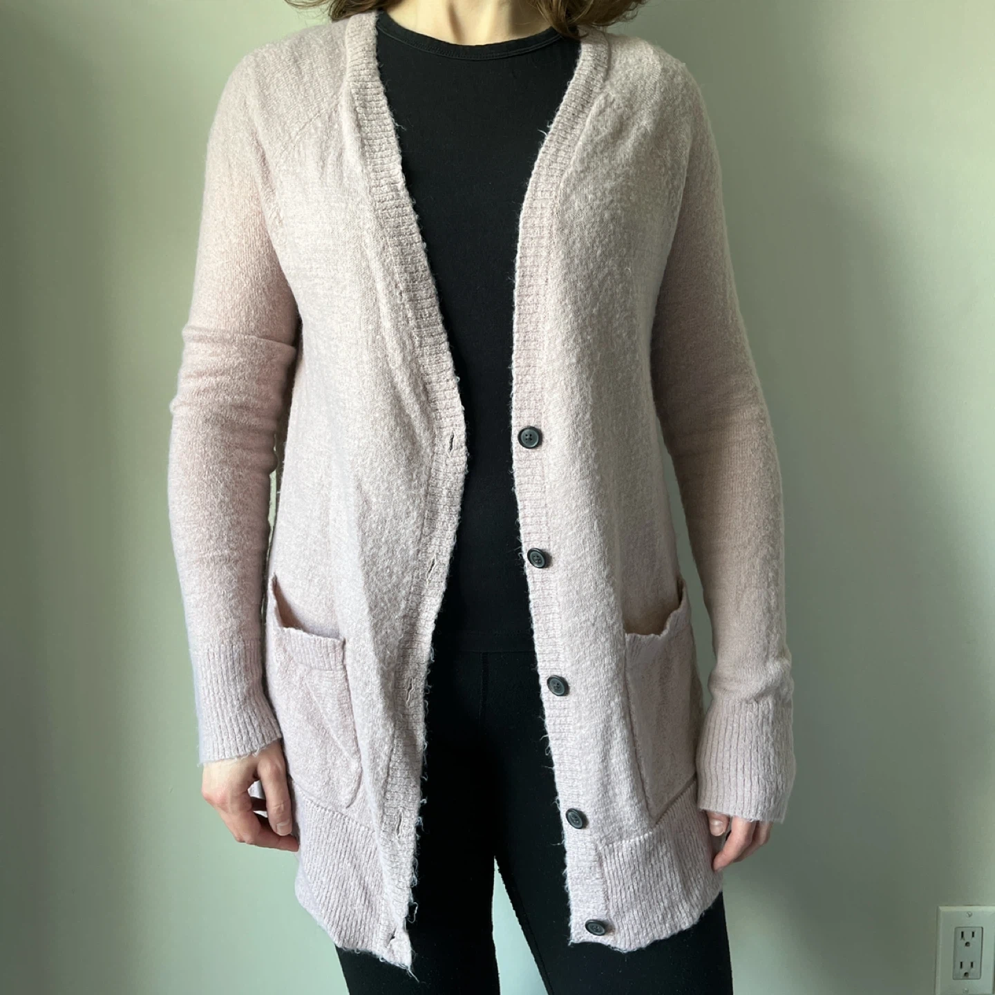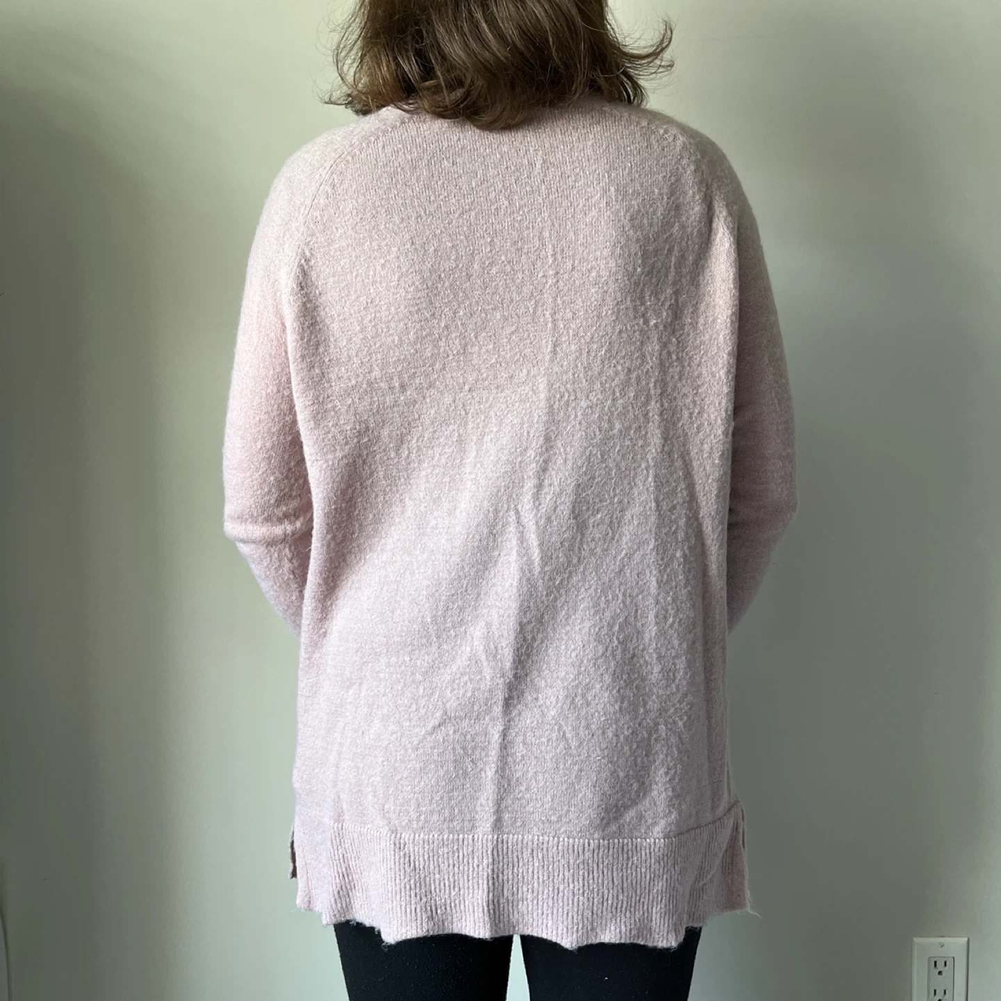 American Eagle soft pink fuzzy cardigan with button up detail and two front pockets.