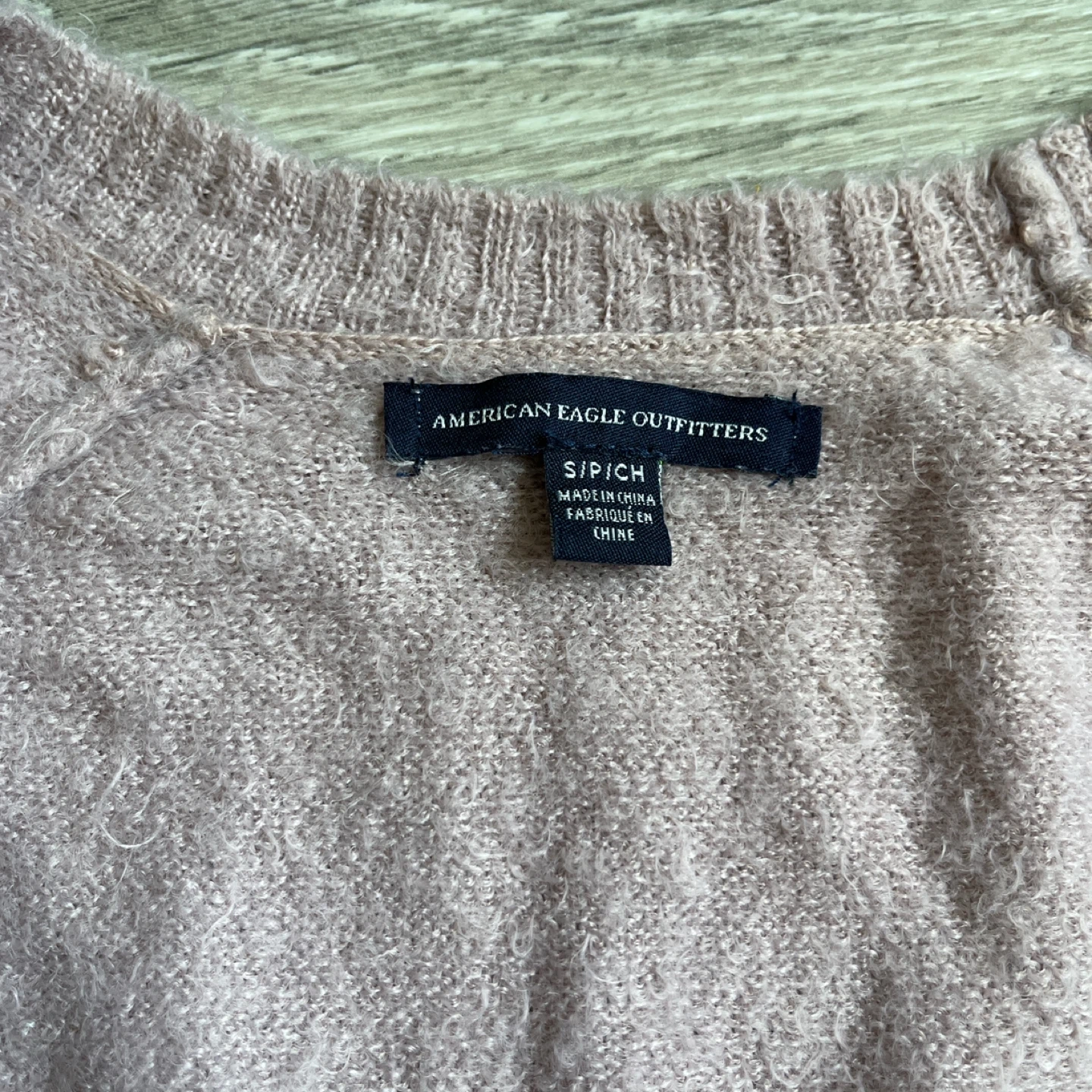 American Eagle soft pink fuzzy cardigan with button up detail and two front pockets.