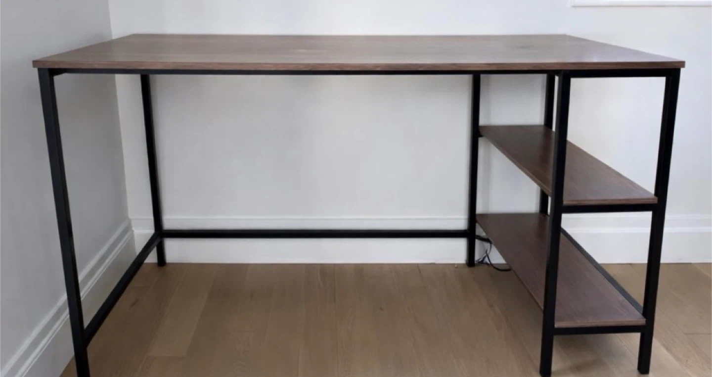 This desk features a wood-look top and two built-in shelves. It has a sturdy black metal frame. The shelves are on the right side of the desk. Available for pick up between March 31st and April 2nd