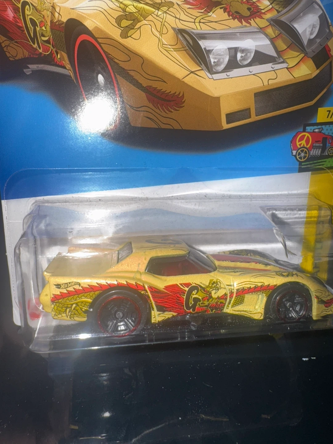 This is a Hot Wheels Custom 2020 Corvette in a yellow color with a dragon design. It's in its original packaging, ready for display or play! A cool addition for any car collector.