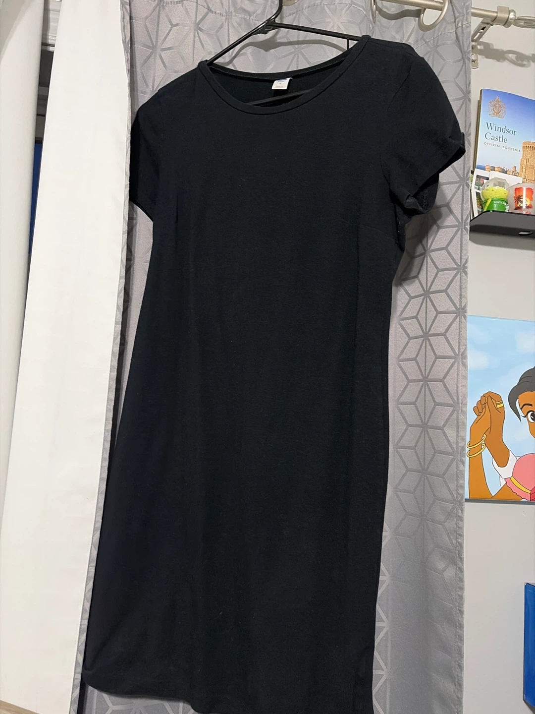 A simple black t-shirt dress. It's made of a soft cotton blend. This dress is versatile for everyday wear.
