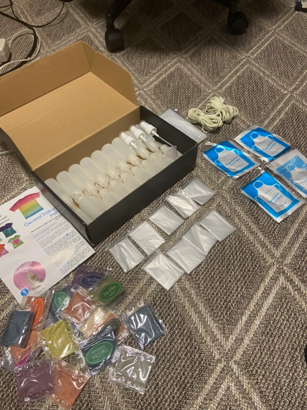 Includes bottles, dyes, rubber bands, plastic gloves, plastic aprons, and an instruction manual. Great for crafting projects. Has been used 2 times so doesn’t include everything in the set but most items are still in there and are in like new condition :)