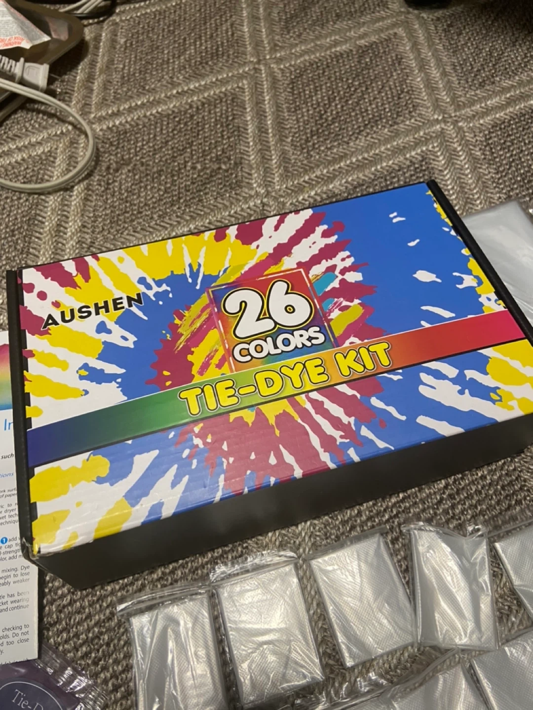 Includes bottles, dyes, rubber bands, plastic gloves, plastic aprons, and an instruction manual. Great for crafting projects. Has been used 2 times so doesn’t include everything in the set but most items are still in there and are in like new condition :)