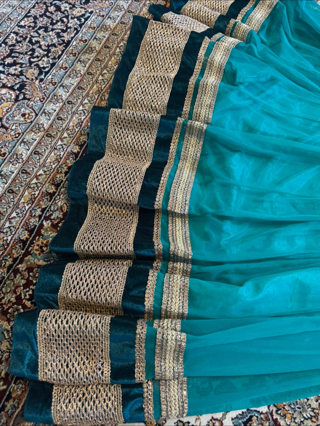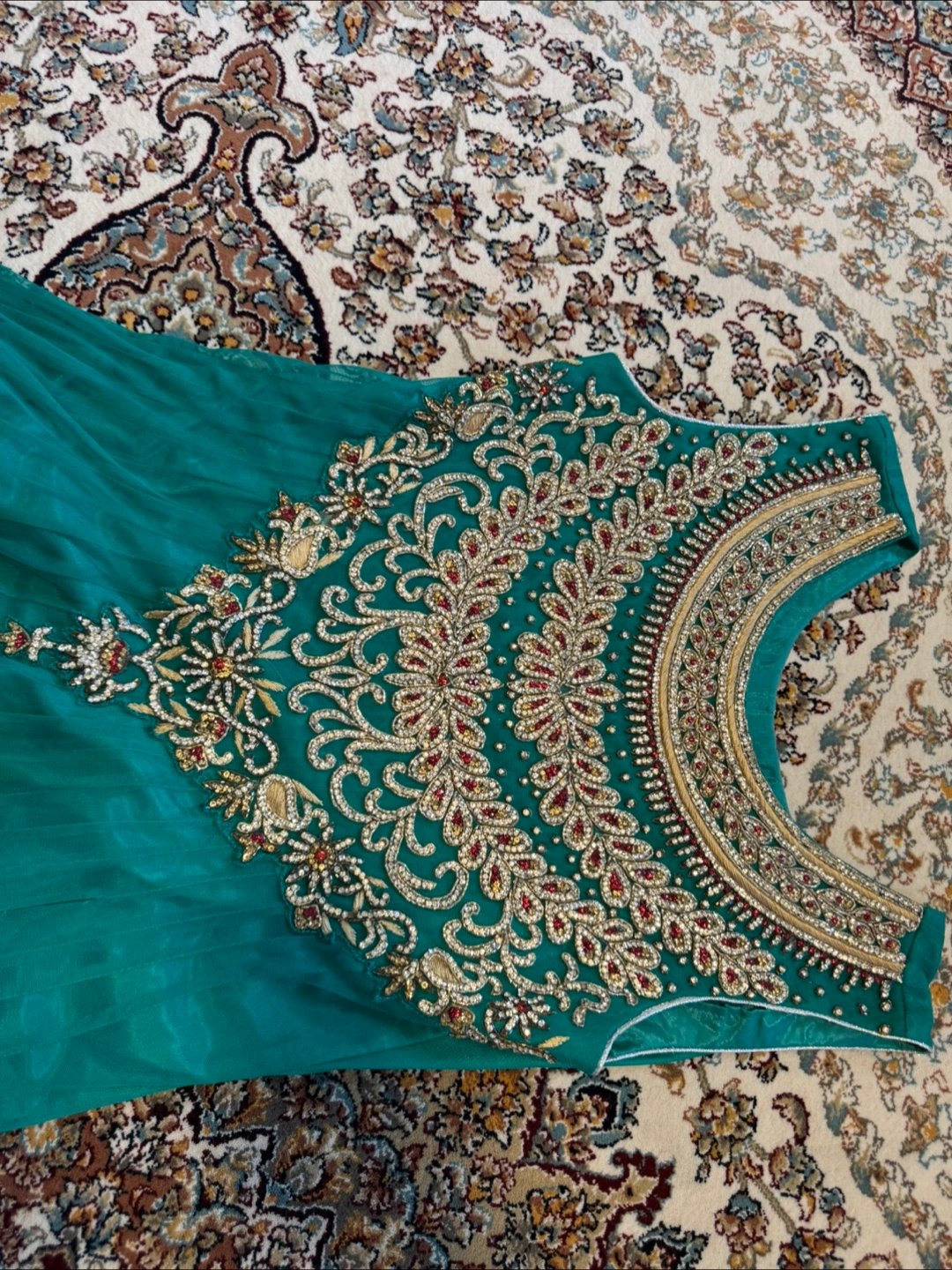 Beautiful teal Anarkali dress with intricate embellishments. This dress is perfect for special occasions and is in great condition. It features detailed embroidery and a flowing silhouette.