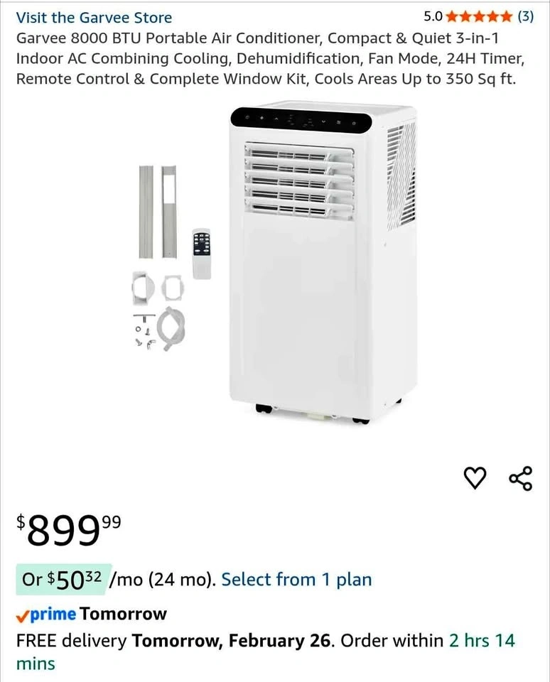 Brand new in box. This 8000 BTU portable AC quickly dispels intense heat, providing fast and effective cooling for spaces up to 350 sq ft—such as bedrooms, home offices, or apartments—keeping you cool and comfortable during hot summer days. It also functions as a fan and dehumidifier, reducing indoor humidity for all-round comfort.