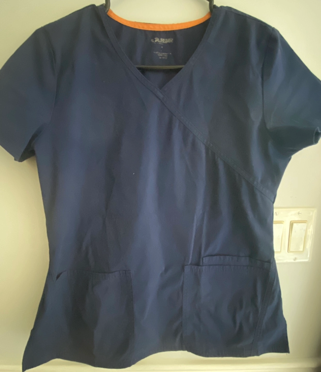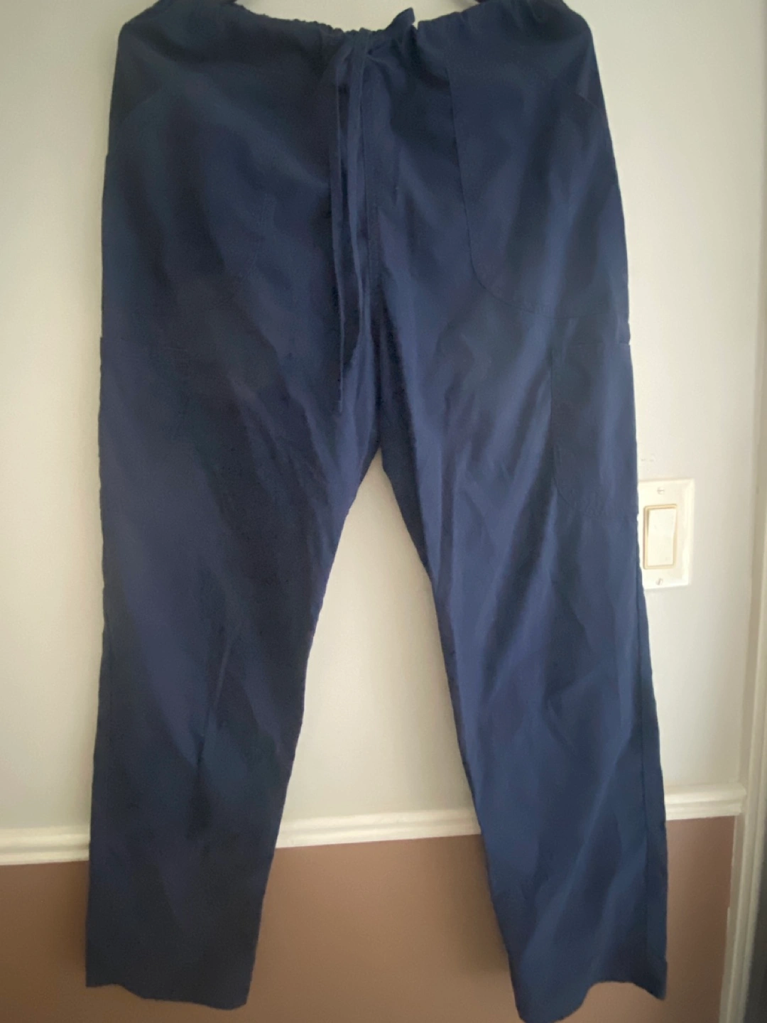 Set of women's navy blue scrubs. Includes top and pants. Size Medium. Two pockets on top. Drawstring waist on pants. Price negotiable