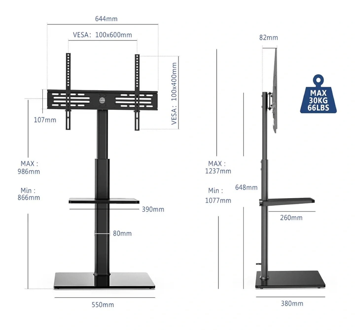 This black, metal TV stand from FITUEYES can hold TVs up to 66 lbs. Suitable for 32”-60” TV’s. It features a height-adjustable mount and a tempered glass base for stability. The shelf is not included. The Brackets and Hardware are inculded!! (Not pictured)