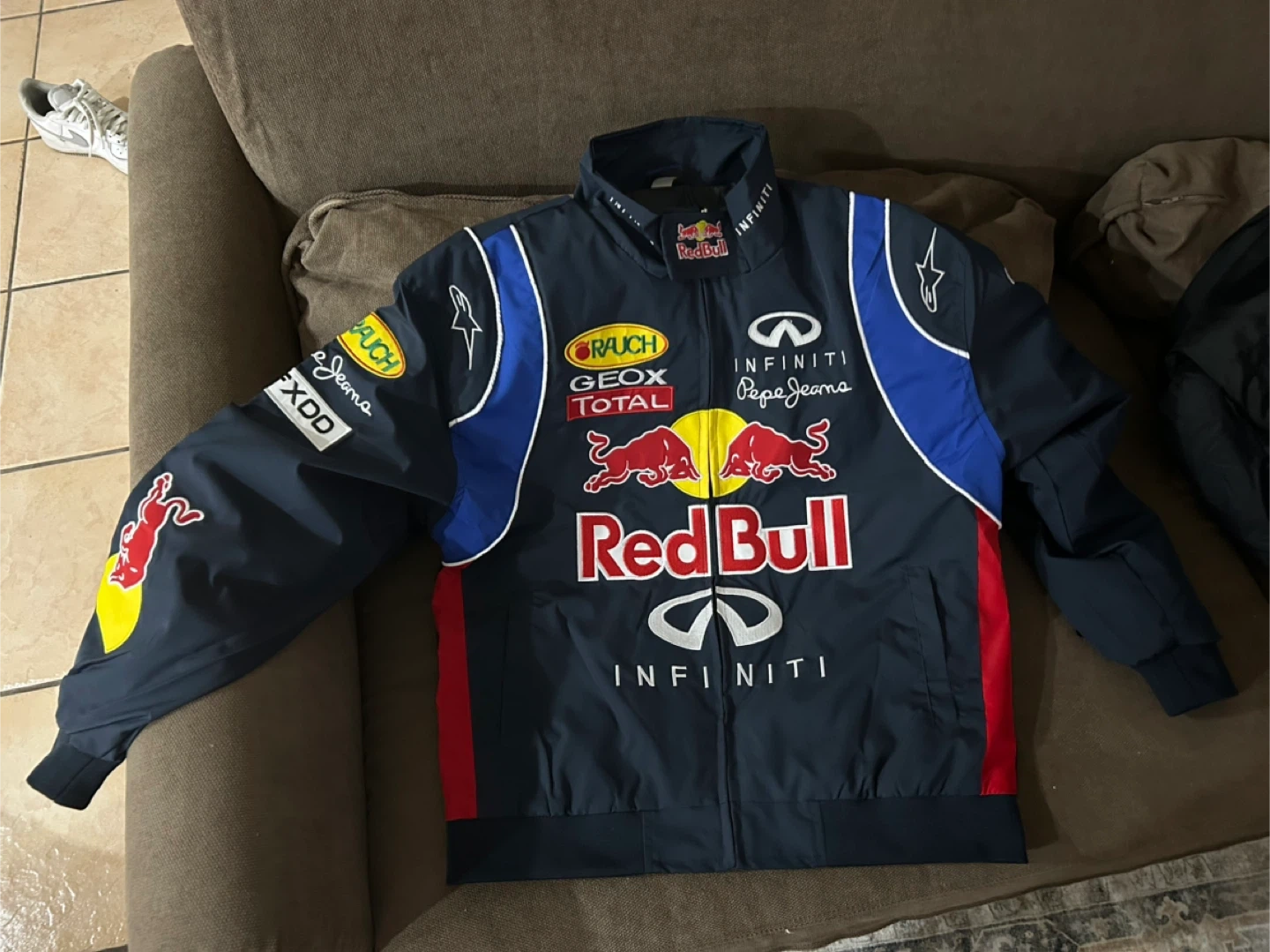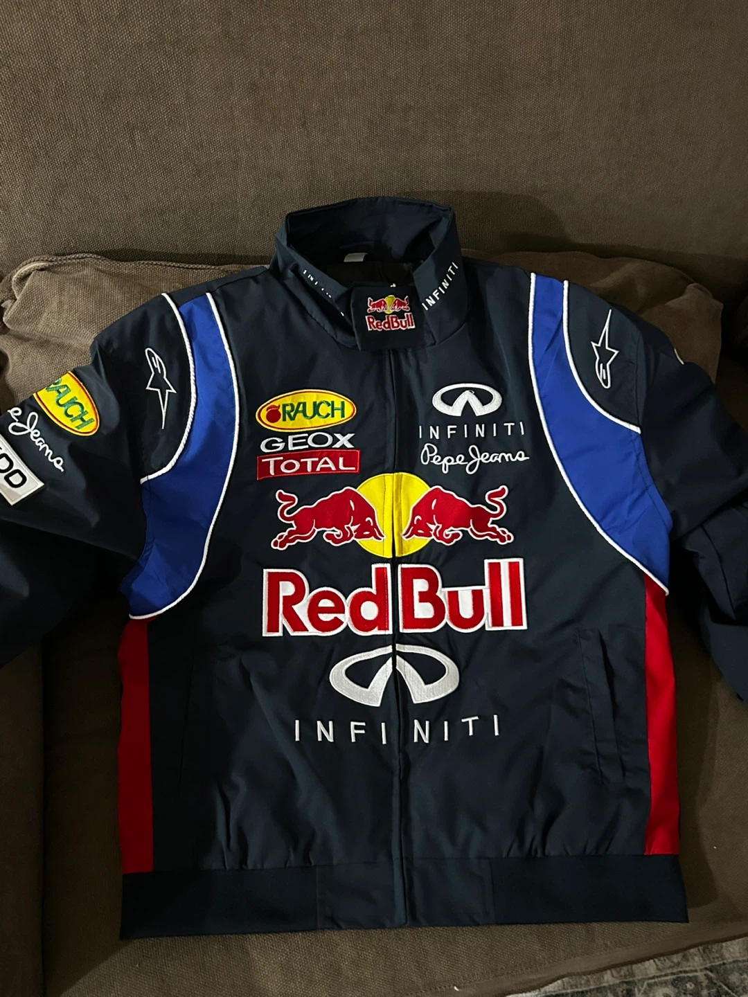 This Red Bull Infiniti racing jacket features multiple sponsor logos. It's made from a durable material. This jacket is perfect for any motorsports fan!